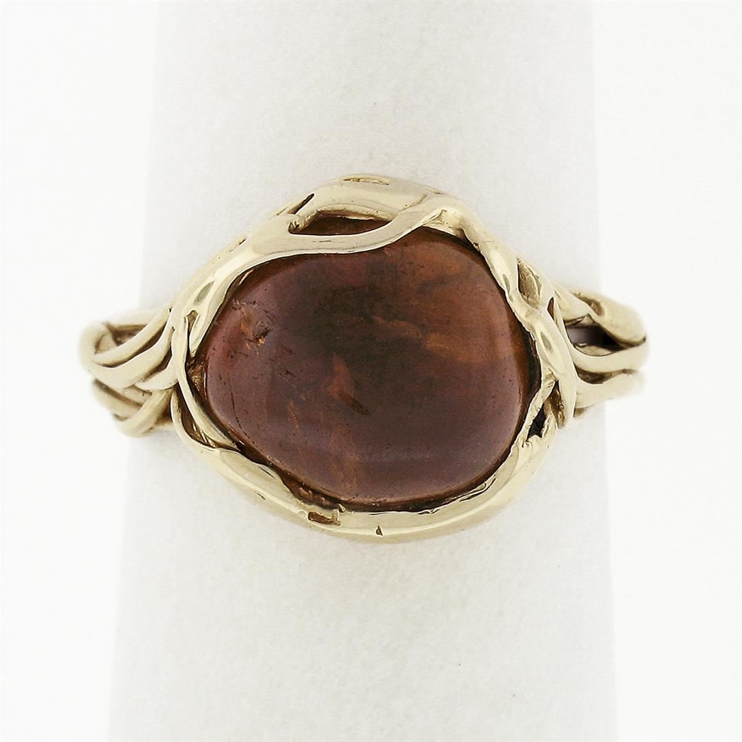 A vintage solid 14k yellow gold free from ring, with 1 semi oval cabochon cut natural amber (10.6x9.3mm). The ring is size 6.0, weighs a total of 6.38 grams, and measures 13.7mm wide.