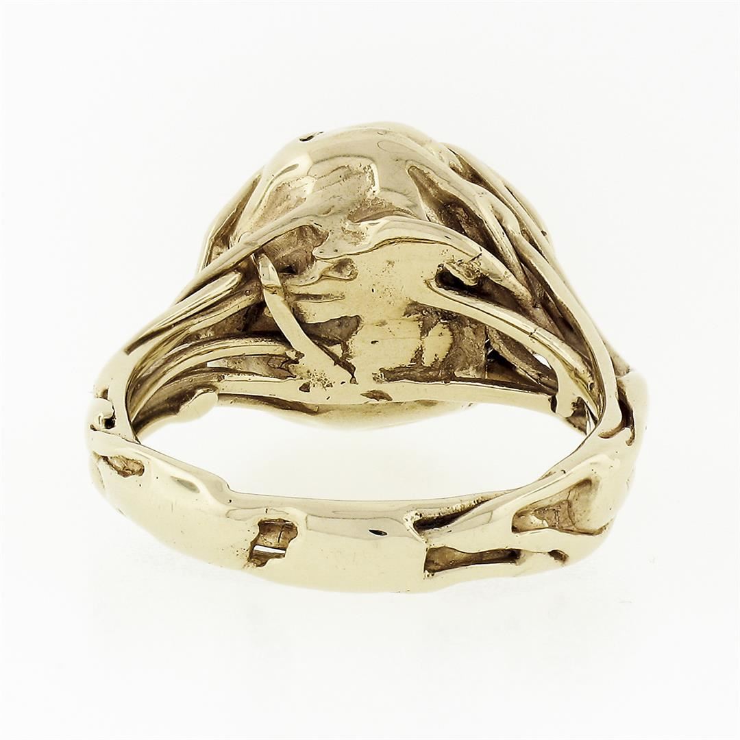 A vintage solid 14k yellow gold free from ring, with 1 semi oval cabochon cut natural amber (10.6x9.3mm). The ring is size 6.0, weighs a total of 6.38 grams, and measures 13.7mm wide.