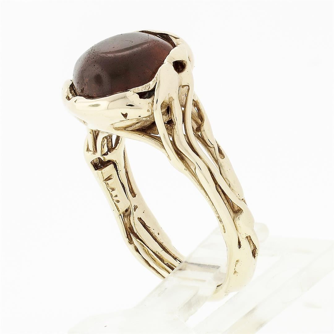 A vintage solid 14k yellow gold free from ring, with 1 semi oval cabochon cut natural amber (10.6x9.3mm). The ring is size 6.0, weighs a total of 6.38 grams, and measures 13.7mm wide.