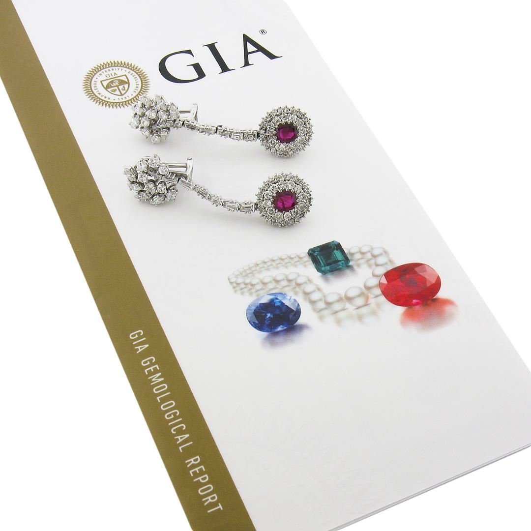 A vintage solid 14k white gold dangle earrings, with 2 GIA graded oval brilliant cut natural rubies (1.90ctw), and 84 round & single cut, 10 marquise cut, 14 tapered baguette cut natrual diamonds (G-I - VS2/SI1 ; 3.46ctw). The earrings measure approximately 52.2x14.7mm and weigh a total of 14.77 grams. Comes with all original relevant certifications.