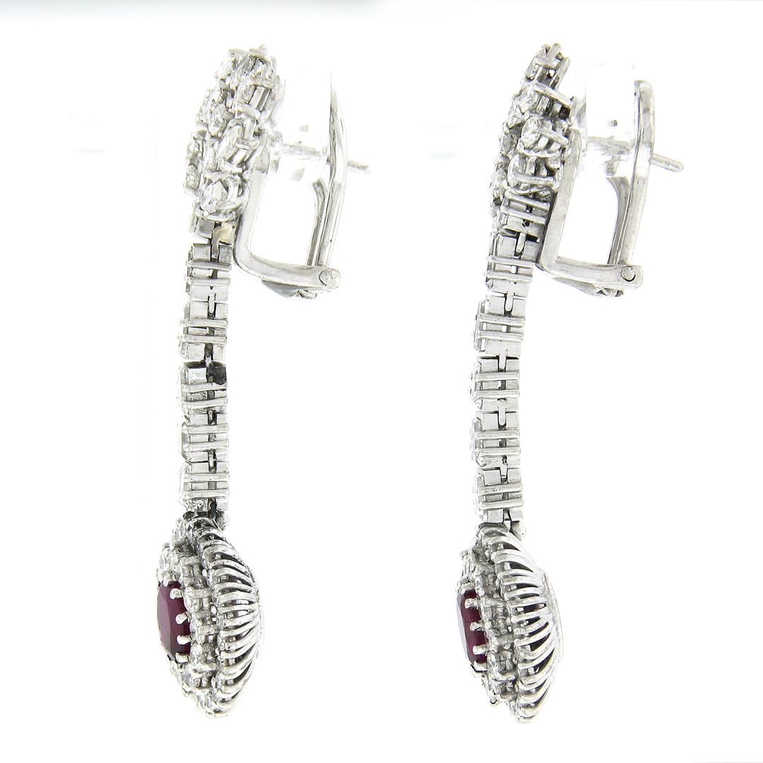 A vintage solid 14k white gold dangle earrings, with 2 GIA graded oval brilliant cut natural rubies (1.90ctw), and 84 round & single cut, 10 marquise cut, 14 tapered baguette cut natrual diamonds (G-I - VS2/SI1 ; 3.46ctw). The earrings measure approximately 52.2x14.7mm and weigh a total of 14.77 grams. Comes with all original relevant certifications.