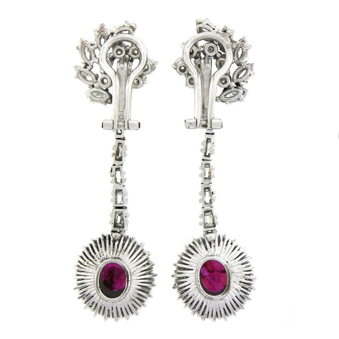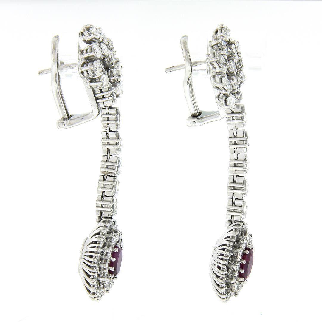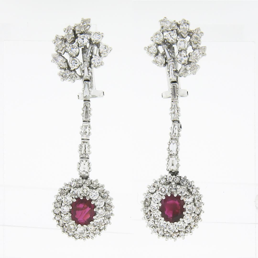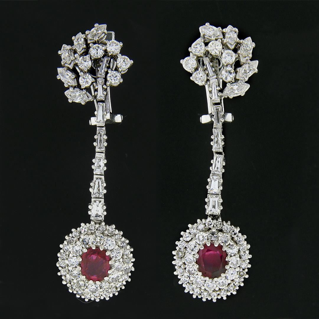 A vintage solid 14k white gold dangle earrings, with 2 GIA graded oval brilliant cut natural rubies (1.90ctw), and 84 round & single cut, 10 marquise cut, 14 tapered baguette cut natrual diamonds (G-I - VS2/SI1 ; 3.46ctw). The earrings measure approximately 52.2x14.7mm and weigh a total of 14.77 grams. Comes with all original relevant certifications.