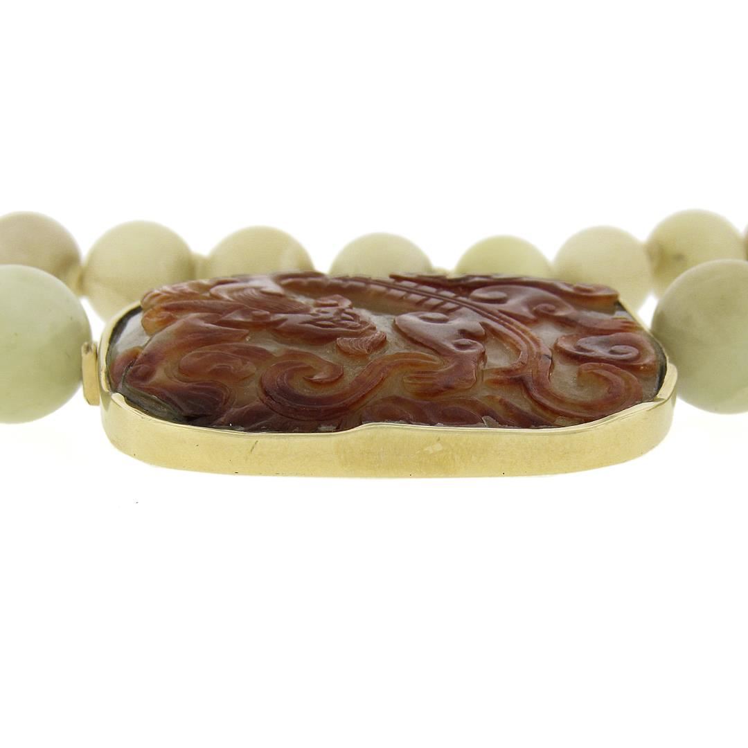 A vintage 14k yellow gold set of bead jade necklace and earrings, with 30 bead natural jade (13.61 - 13.67mm), 1 GIA graded carved custom cut natural jade (47.41x38.05mm), and 4 bead shape natural jade (11.9-13.1mm). 16.5 inch bead link chain, 133.40 grams total weight, pendant measures 39.2x48.8mm. The earrings measure approximately 24.9x13.1mm and weigh a total of 16.22 grams. Comes with all original relevant certifications.