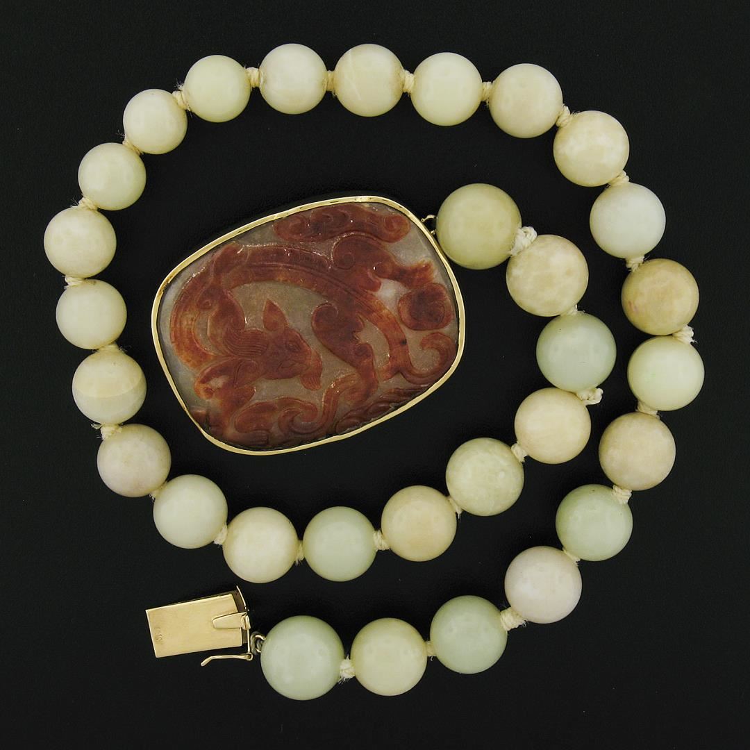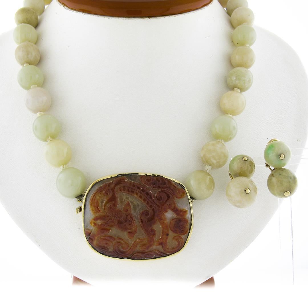 A vintage 14k yellow gold set of bead jade necklace and earrings, with 30 bead natural jade (13.61 - 13.67mm), 1 GIA graded carved custom cut natural jade (47.41x38.05mm), and 4 bead shape natural jade (11.9-13.1mm). 16.5 inch bead link chain, 133.40 grams total weight, pendant measures 39.2x48.8mm. The earrings measure approximately 24.9x13.1mm and weigh a total of 16.22 grams. Comes with all original relevant certifications.