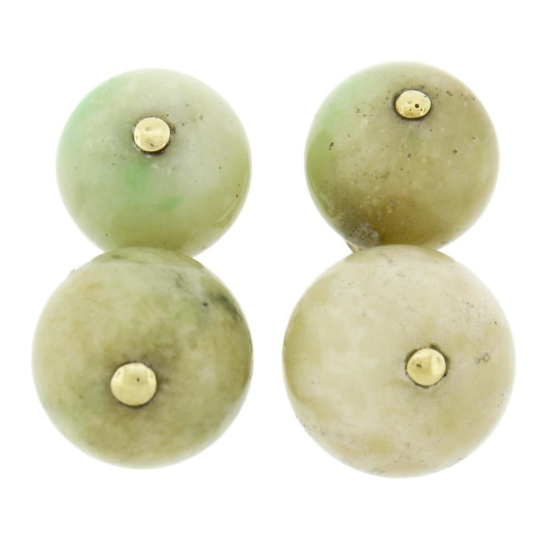 A vintage 14k yellow gold set of bead jade necklace and earrings, with 30 bead natural jade (13.61 - 13.67mm), 1 GIA graded carved custom cut natural jade (47.41x38.05mm), and 4 bead shape natural jade (11.9-13.1mm). 16.5 inch bead link chain, 133.40 grams total weight, pendant measures 39.2x48.8mm. The earrings measure approximately 24.9x13.1mm and weigh a total of 16.22 grams. Comes with all original relevant certifications.