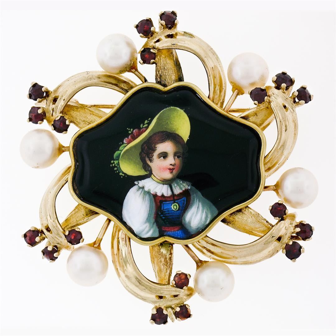 Vintage 14k Gold Hand Painted Portrait, Garnet, & Pearl Open Frame Brooch