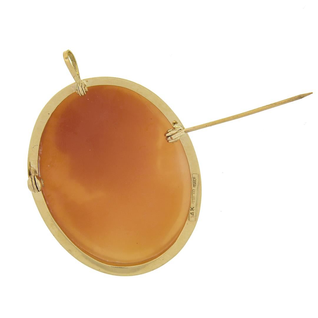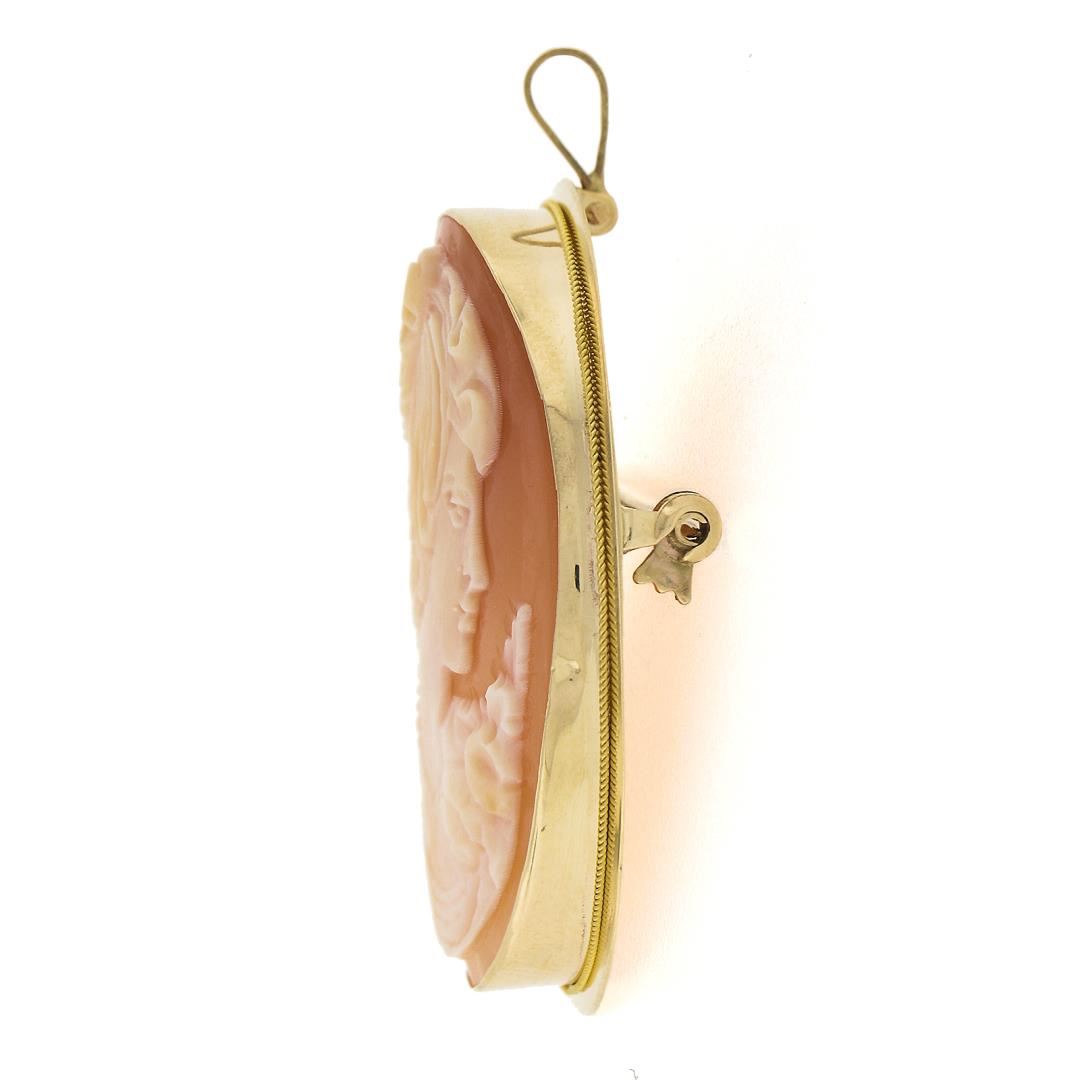 A vintage solid 14k yellow gold brooch pendant, with 1 oval carved cameo shell (34.1x26.8mm). Measures 43.9x30.7mm and weighs a total of 6.47 grams, and the inside bail dimension is 5.1x3mm