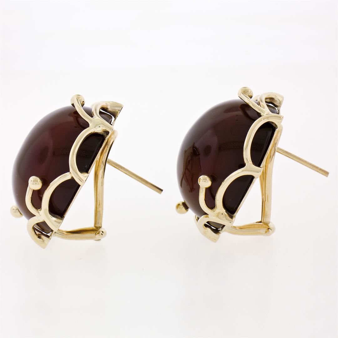Vintage 14k Gold Large Domed Cabochon Carnelian Button Earrings & Detailed Frame. Please see photos and description for all available information. a vintage solid 14k yellow gold button earrings, with 2 round cabochon cut natural genuine carnelian (19.80mm). The earrings measure approximately 24.25mm in diameter and weigh a total of 21.18 grams.
