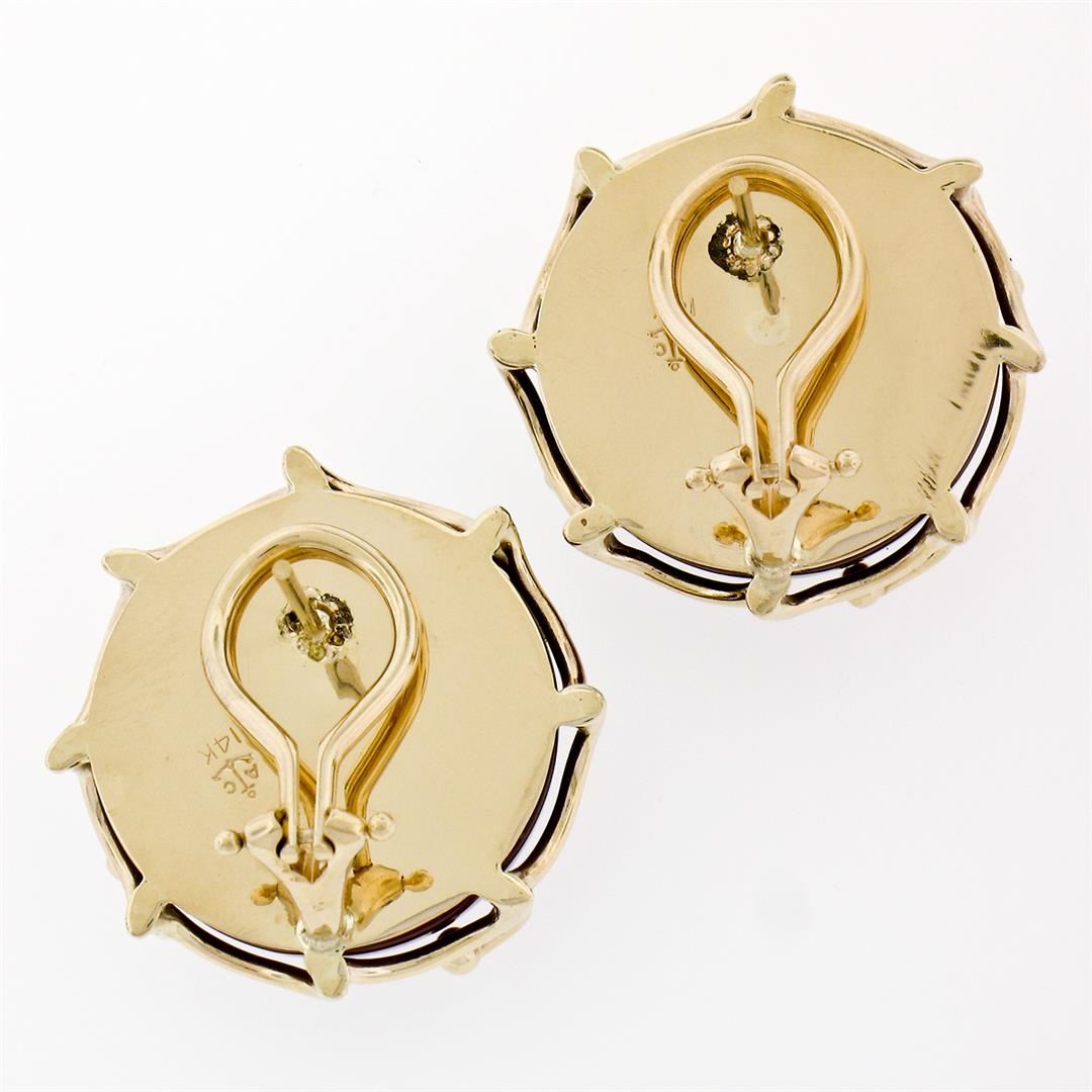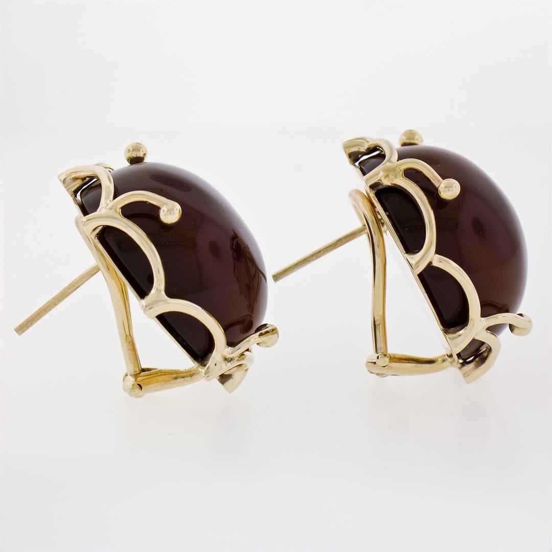 Vintage 14k Gold Large Domed Cabochon Carnelian Button Earrings & Detailed Frame. Please see photos and description for all available information. a vintage solid 14k yellow gold button earrings, with 2 round cabochon cut natural genuine carnelian (19.80mm). The earrings measure approximately 24.25mm in diameter and weigh a total of 21.18 grams.