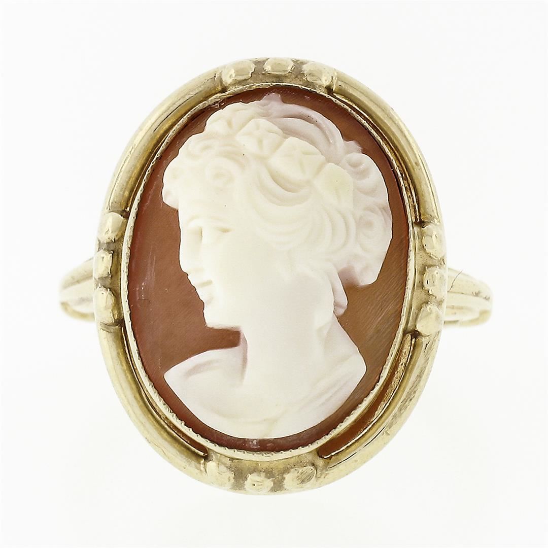 Vintage 14k Gold Milgrain Bezel Set Oval Carved Shell Cameo W/ Open Frame Ring