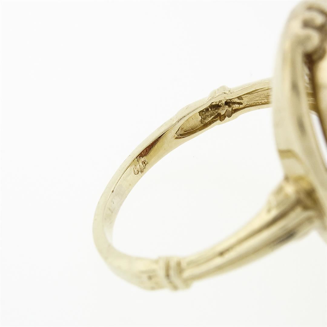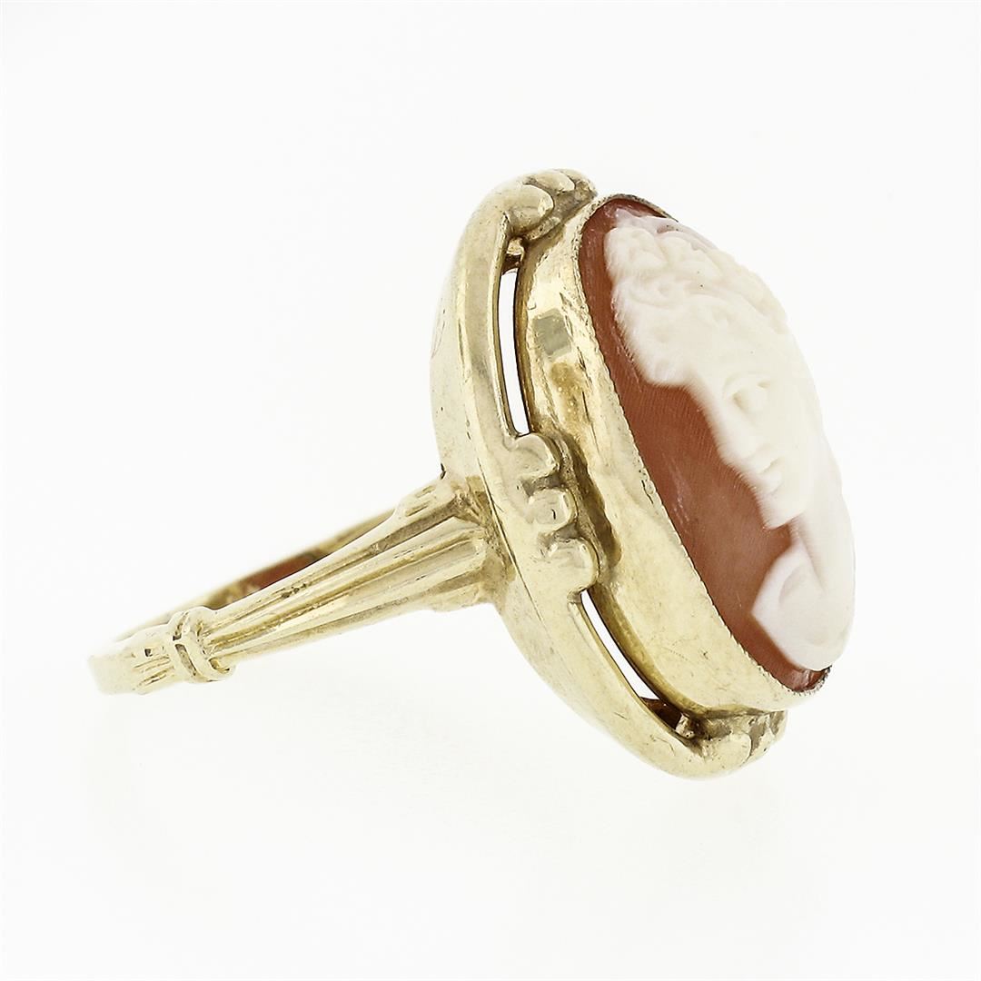 A vintage solid 14k yellow gold ring, featuring 1 oval shape natural carved shell. The ring is size 5.5, weighs a total of 4.14 grams, and measures 19.2mm wide.
