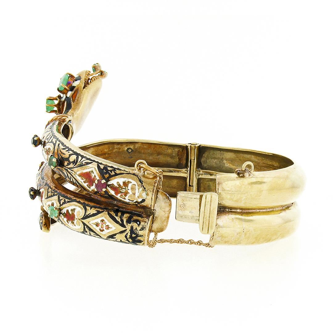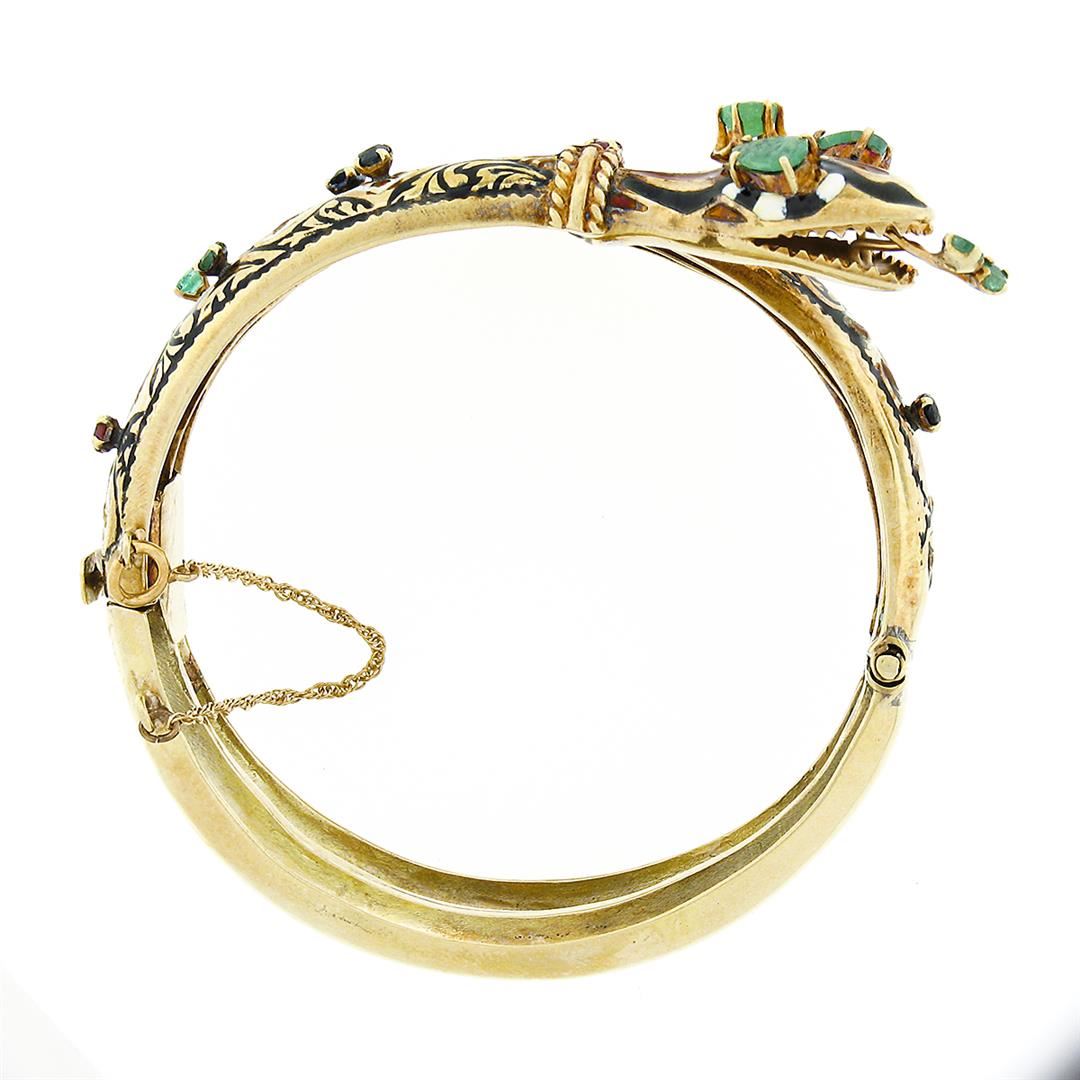 A vintage solid 14k yellow gold snake coiled bangle bracelet, with enamel work & 8 round and pear cut natural emeralds (1.70ctw), with 2 round brilliant cut natural rubies (0.30ctw), and 3 round brilliant cut natural sapphires (0.45ctw). It weighs a total of 71.66 grams, measures 43.80mm wide, and measures 7 inches in length.