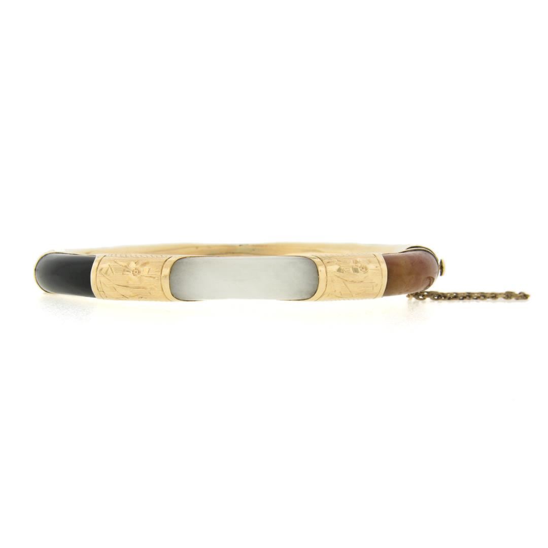 A vintage solid 14k yellow gold bangle bracelet, with 6 curved rounded multicolors natural jades ( 22.6x7.2mm each). It weighs a total of 25.21 grams, measures 7.8mm wide, and measures 7.5 inches in length.