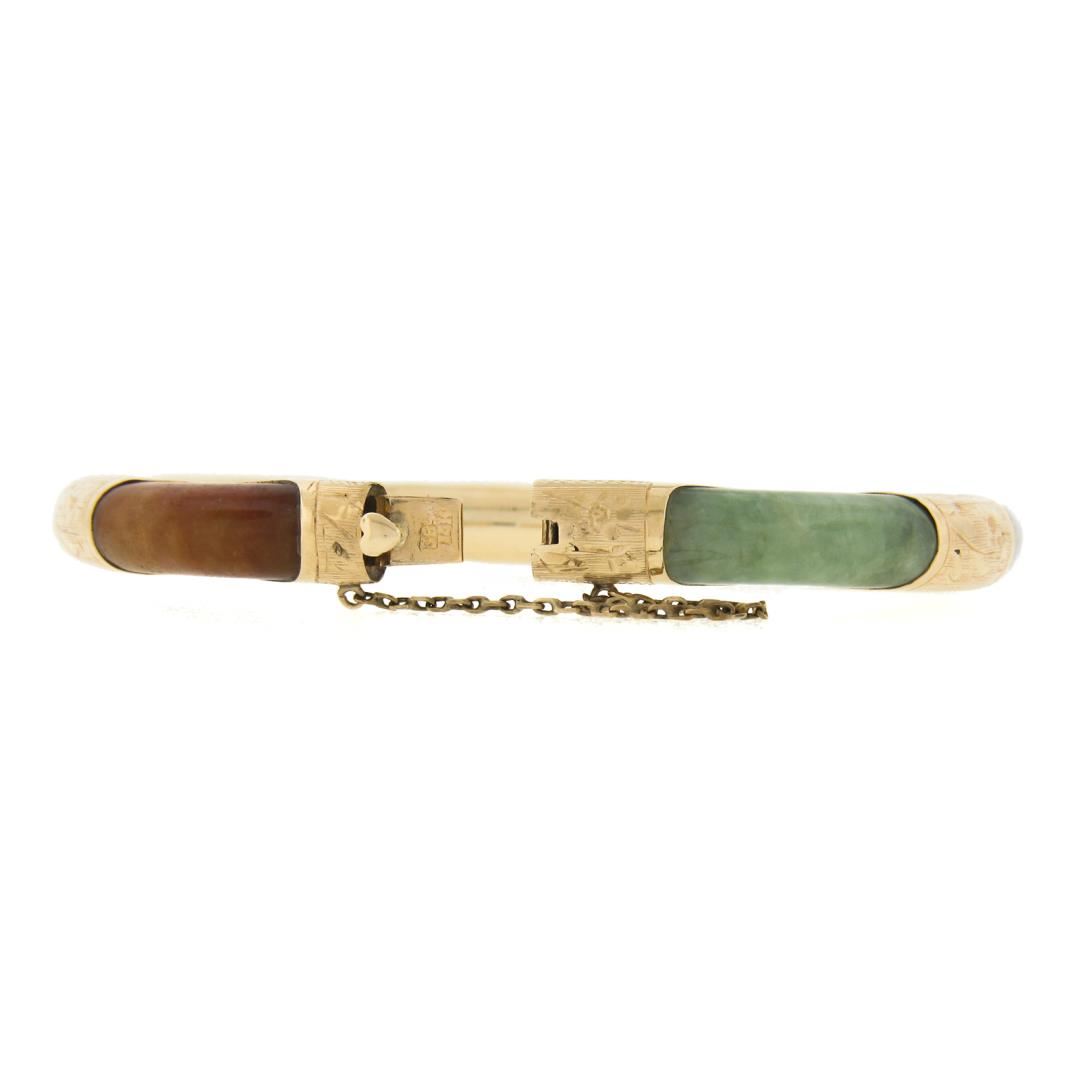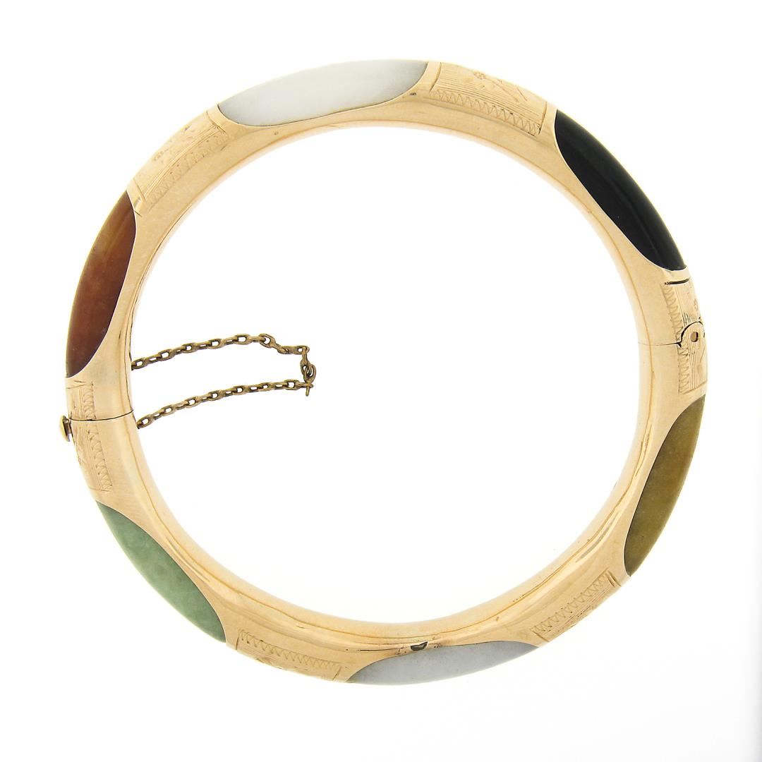 A vintage solid 14k yellow gold bangle bracelet, with 6 curved rounded multicolors natural jades ( 22.6x7.2mm each). It weighs a total of 25.21 grams, measures 7.8mm wide, and measures 7.5 inches in length.