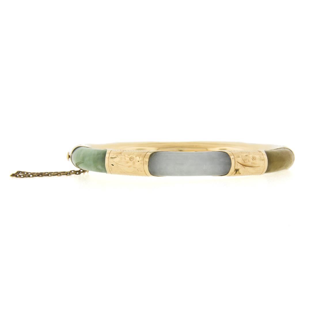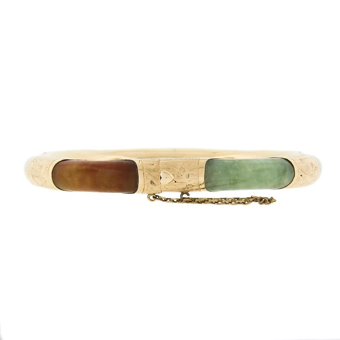 A vintage solid 14k yellow gold bangle bracelet, with 6 curved rounded multicolors natural jades ( 22.6x7.2mm each). It weighs a total of 25.21 grams, measures 7.8mm wide, and measures 7.5 inches in length.