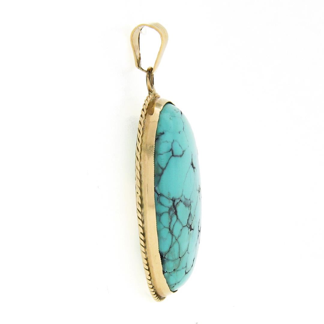 A vintage solid 14k yellow gold pendant, with 1 oval cabochon cut natural turquoise (30x23.5mm). The pendant weighs a total of 11.42 grams, measures 44.3x27mm including the bail, and the inside of the bail measures 6.75x4.4mm.