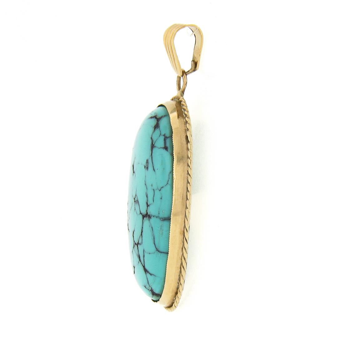 A vintage solid 14k yellow gold pendant, with 1 oval cabochon cut natural turquoise (30x23.5mm). The pendant weighs a total of 11.42 grams, measures 44.3x27mm including the bail, and the inside of the bail measures 6.75x4.4mm.