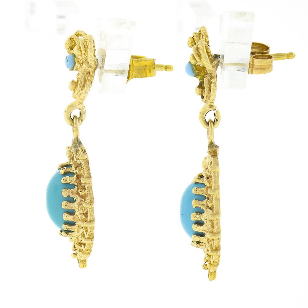 Vintage 14k Gold Oval Cabochon Blue Turquoise Open Textured Drop Dangle Earrings