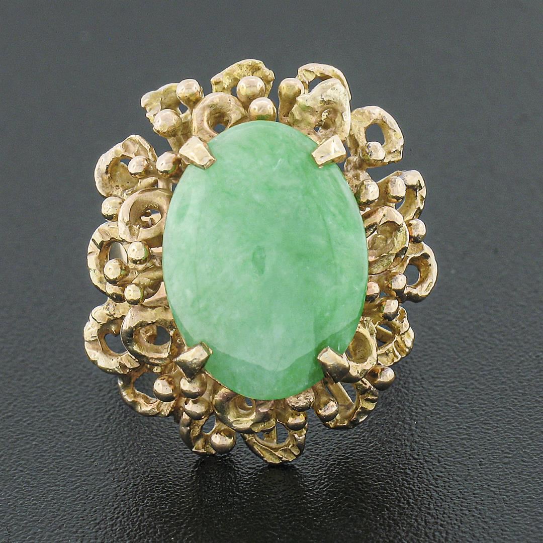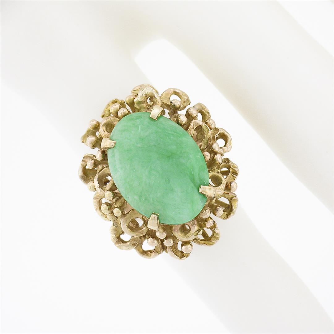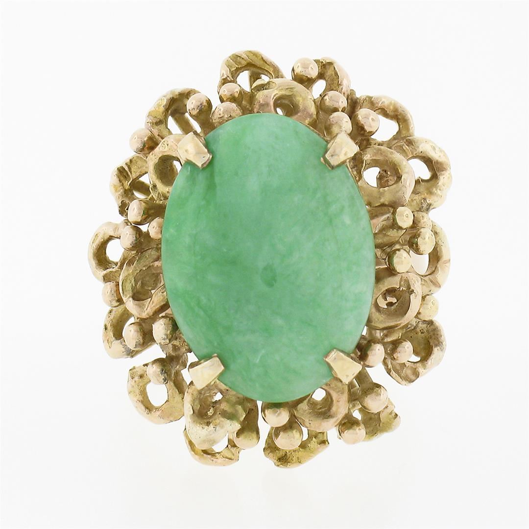 A vintage solid 14k yellow gold ring, with 1 oval cabochon cut natural jade (15.25x11.25mm). The ring is size 3.5, weighs a total of 8.66 grams, and measures 22.50mm wide.