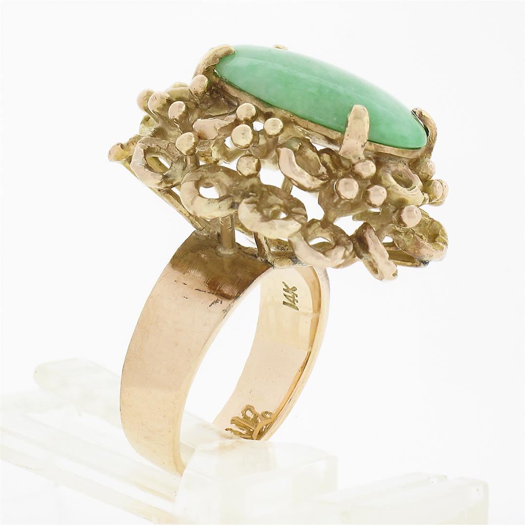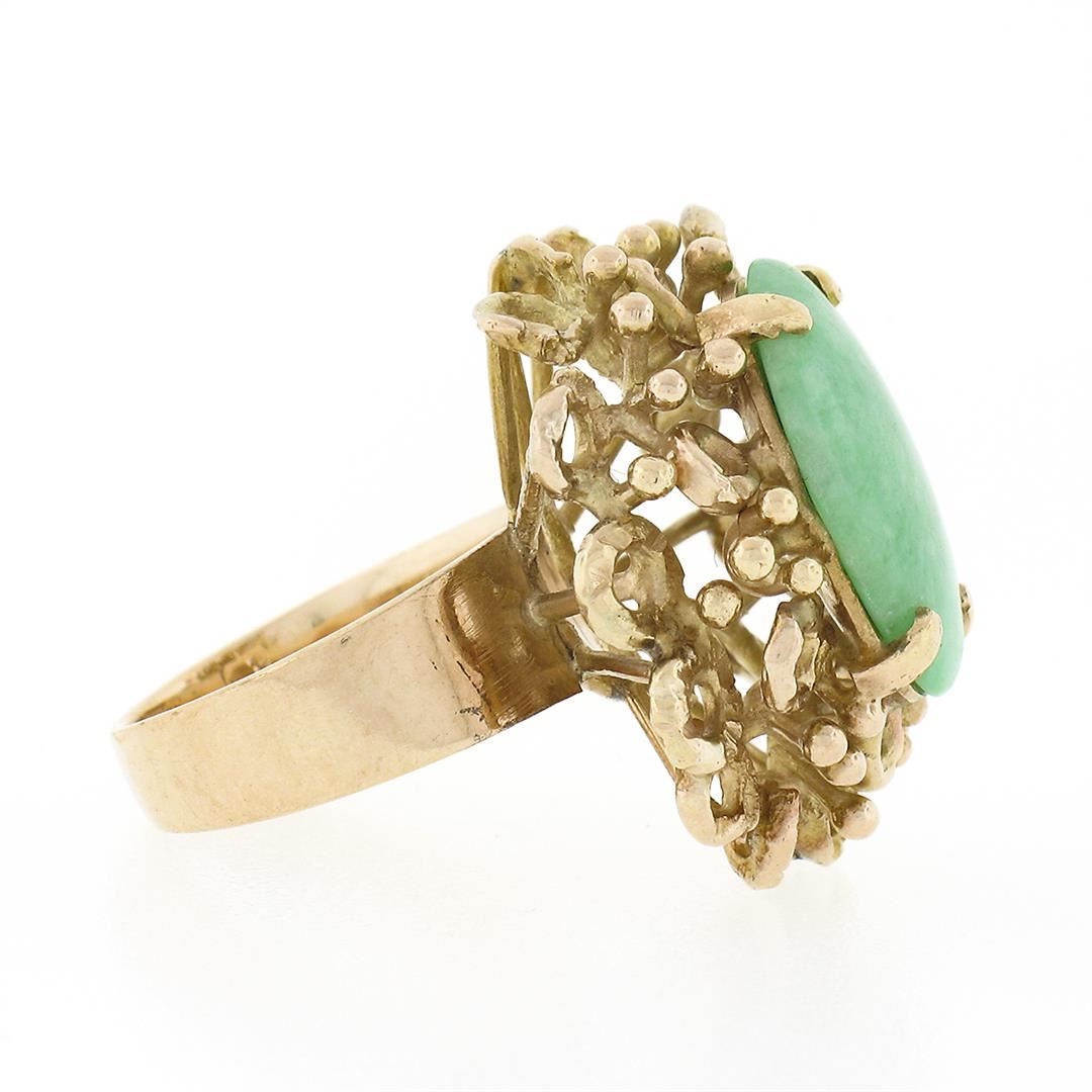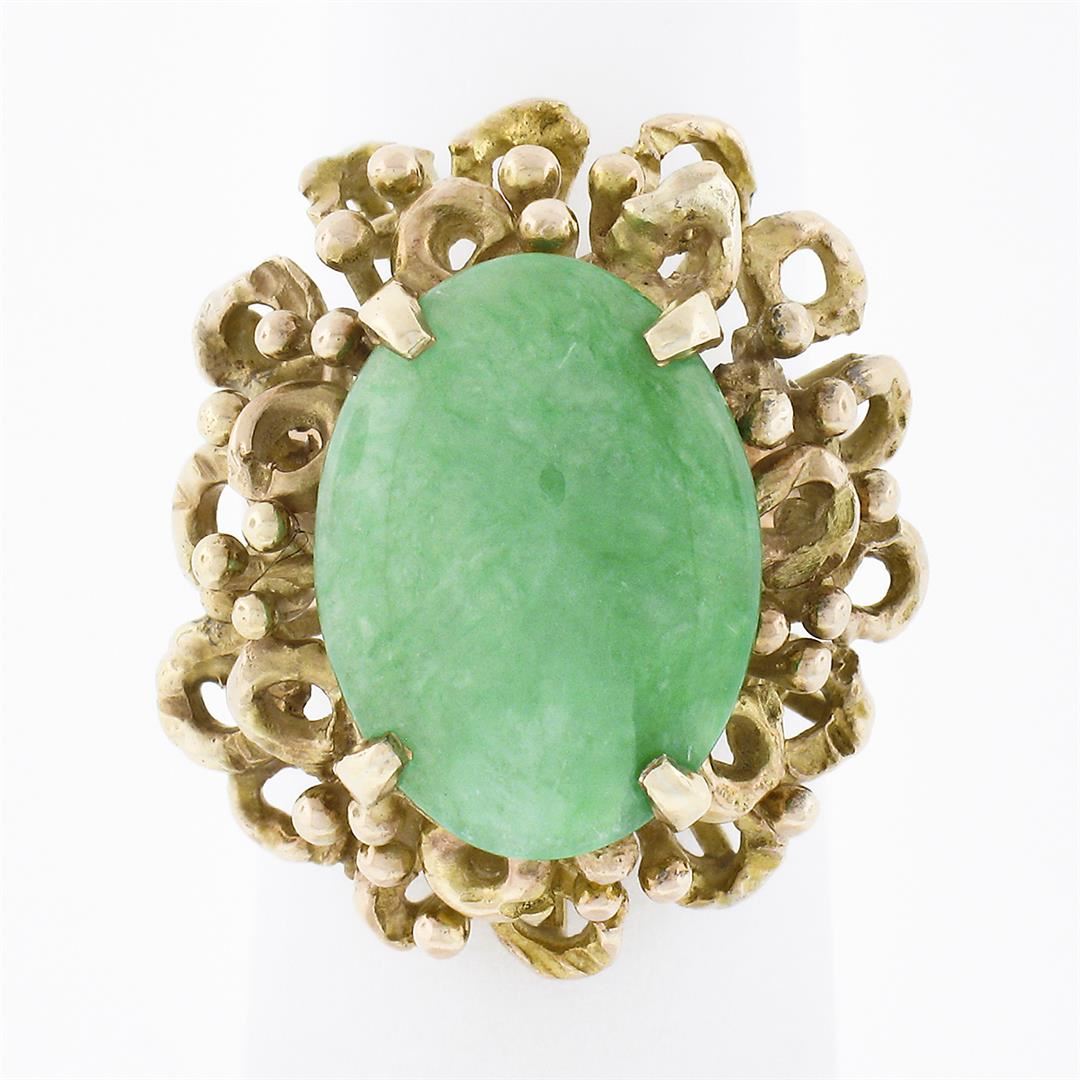 A vintage solid 14k yellow gold ring, with 1 oval cabochon cut natural jade (15.25x11.25mm). The ring is size 3.5, weighs a total of 8.66 grams, and measures 22.50mm wide.