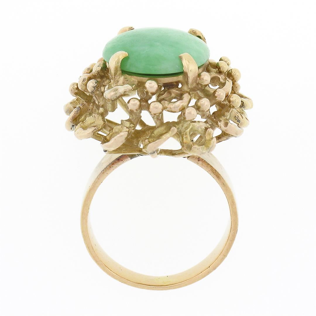 A vintage solid 14k yellow gold ring, with 1 oval cabochon cut natural jade (15.25x11.25mm). The ring is size 3.5, weighs a total of 8.66 grams, and measures 22.50mm wide.