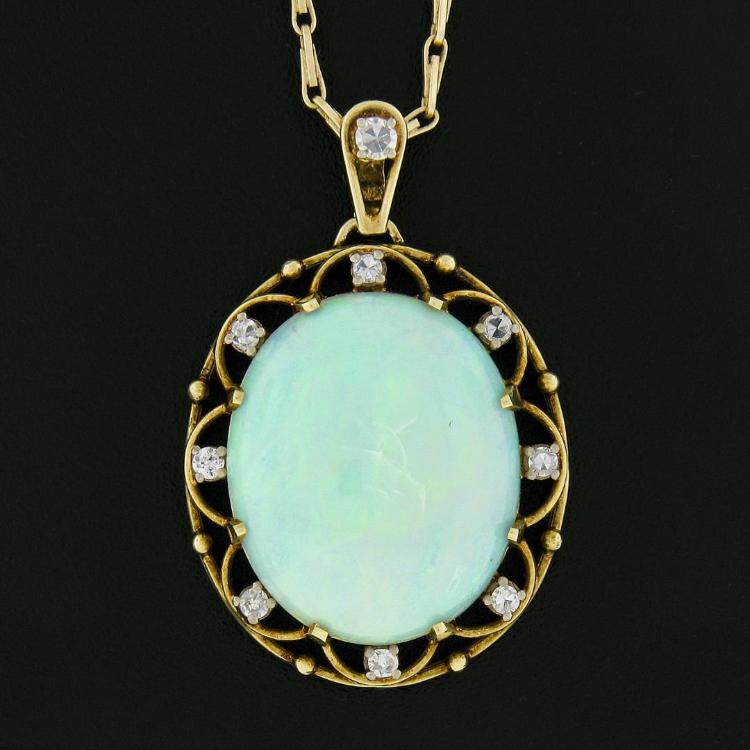 A vintage solid 14k yellow gold pendant necklace, with 1 oval cabochon cut natural opal (22.1x18.5mm), and 9 single cut natrual diamonds (G/H - VS2-SI2 ; 0.28ct ). 15.5 inch fancy link chain, 10.44 grams total weight, pendant measures 37.3x24.6mm.