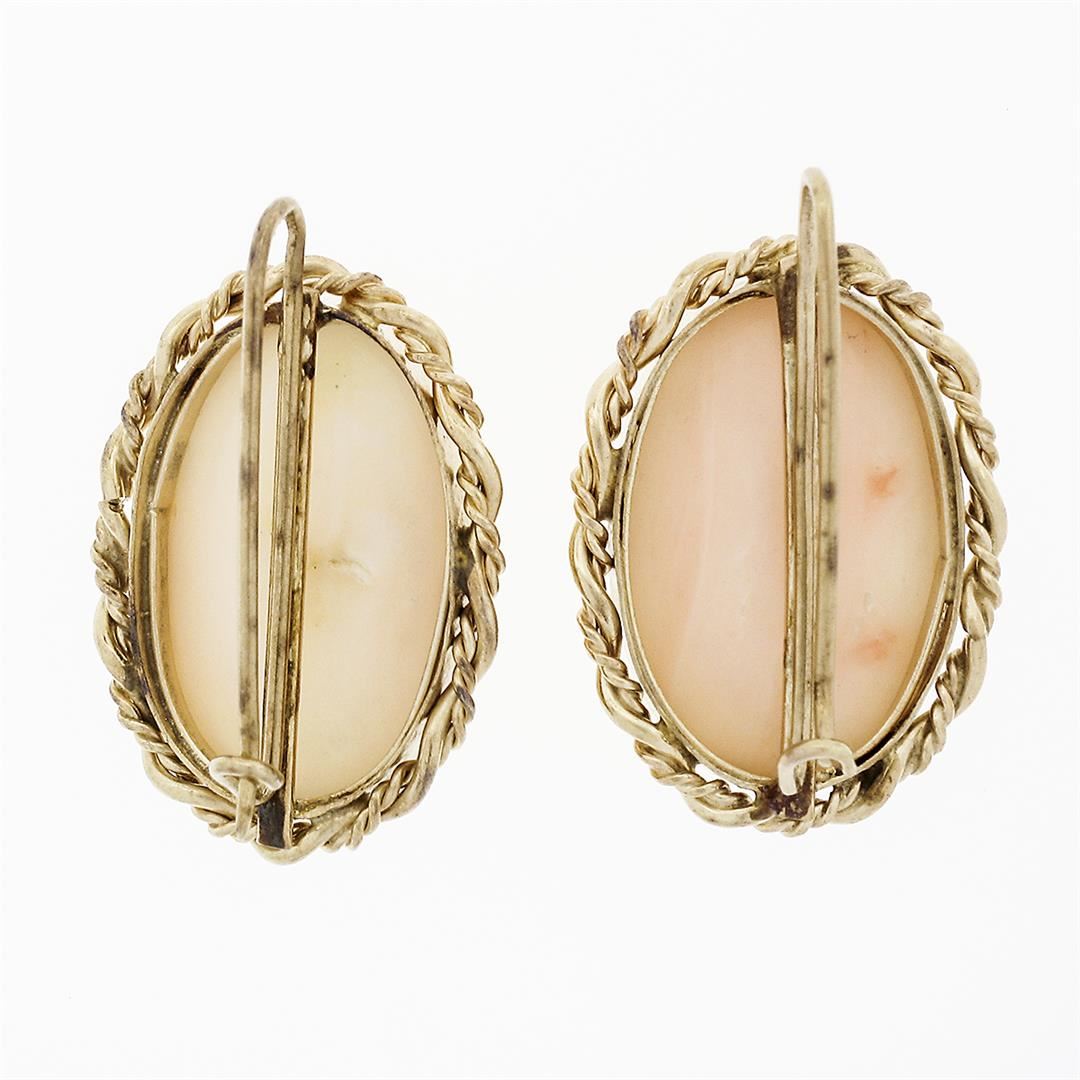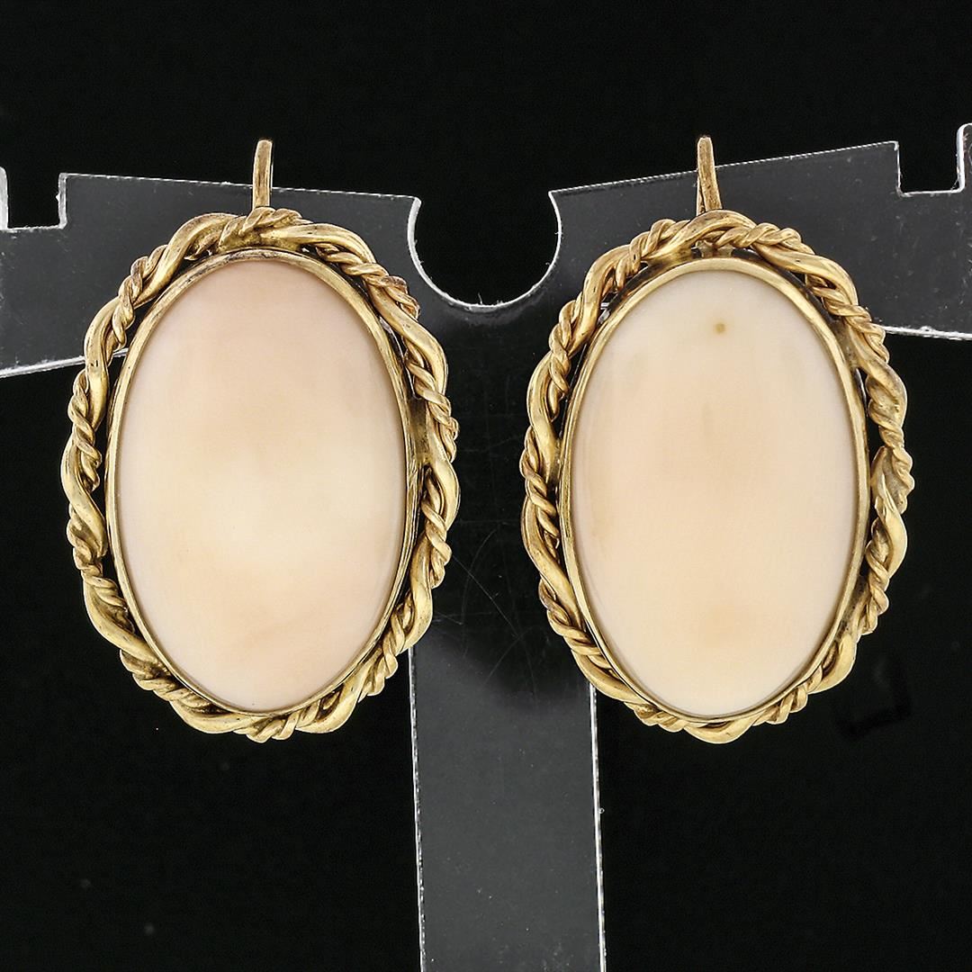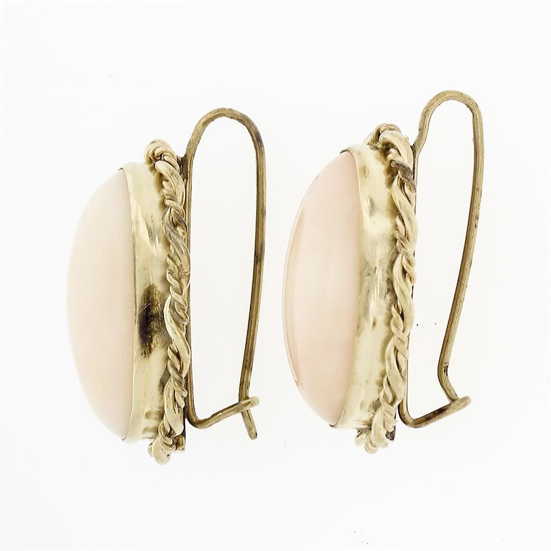 Vintage 14k Gold Oval Cabochon Pink Angel Skin Coral Twisted Frame Drop Earrings