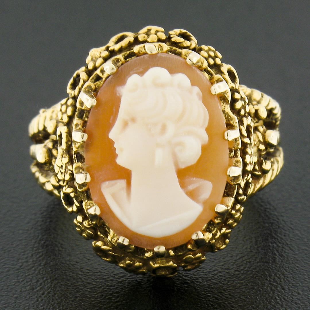 A vintage solid 14k yellow gold cocktail ring, with 1 carved shell cameo (13.9x10.1mm). The ring is size 5.5, weighs a total of 5.73 grams, and measures 17.9mm wide.