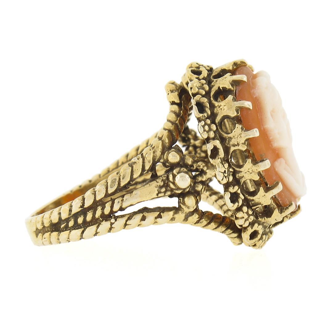 A vintage solid 14k yellow gold cocktail ring, with 1 carved shell cameo (13.9x10.1mm). The ring is size 5.5, weighs a total of 5.73 grams, and measures 17.9mm wide.