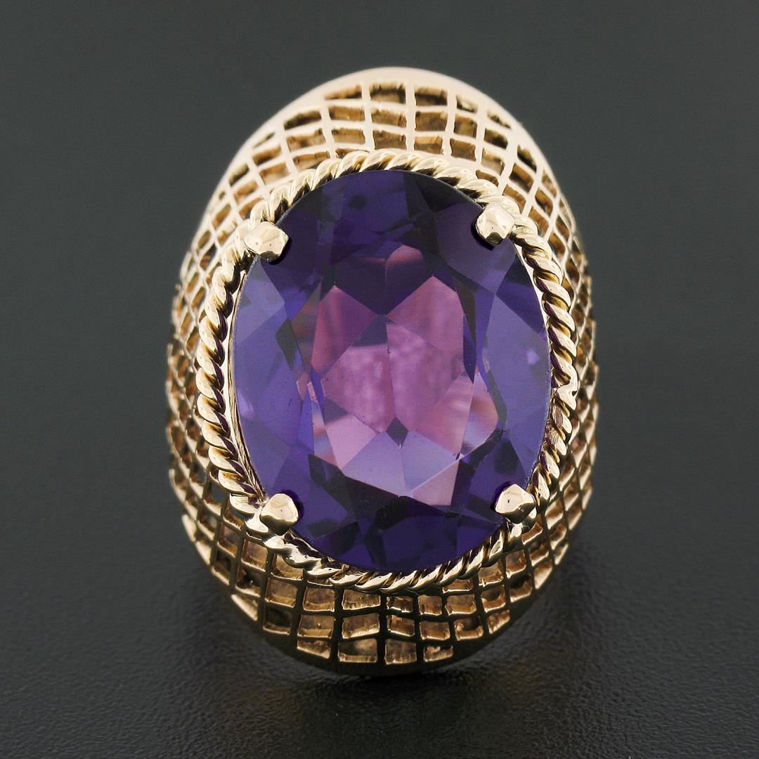 A vintage solid 14k yellow gold ring, with 1 oval cut synthetic alexandrite (17.4x13.65mm). The ring is size 7.0, weighs a total of 8.50 grams, and measures 27.4mm wide.