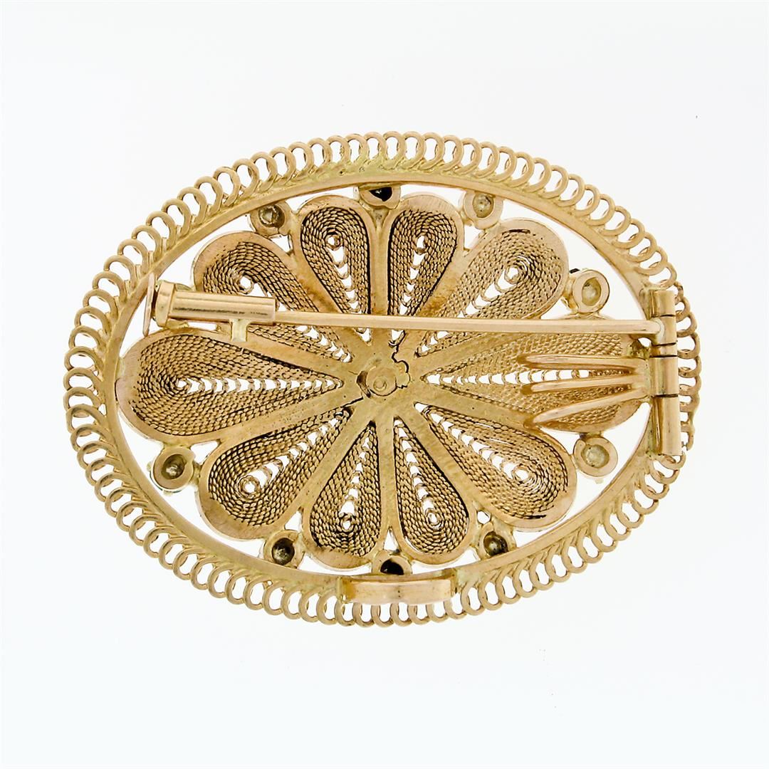 A vintage 14k yellow gold filigree work brooch or pendant with 1 round shaped cultured pearl (5.55mm) surrounded with 10 round cabochon cut natural turquoise (2.85mm). Measures 45.72x35.04mm and weighs a total of 15.00 grams.