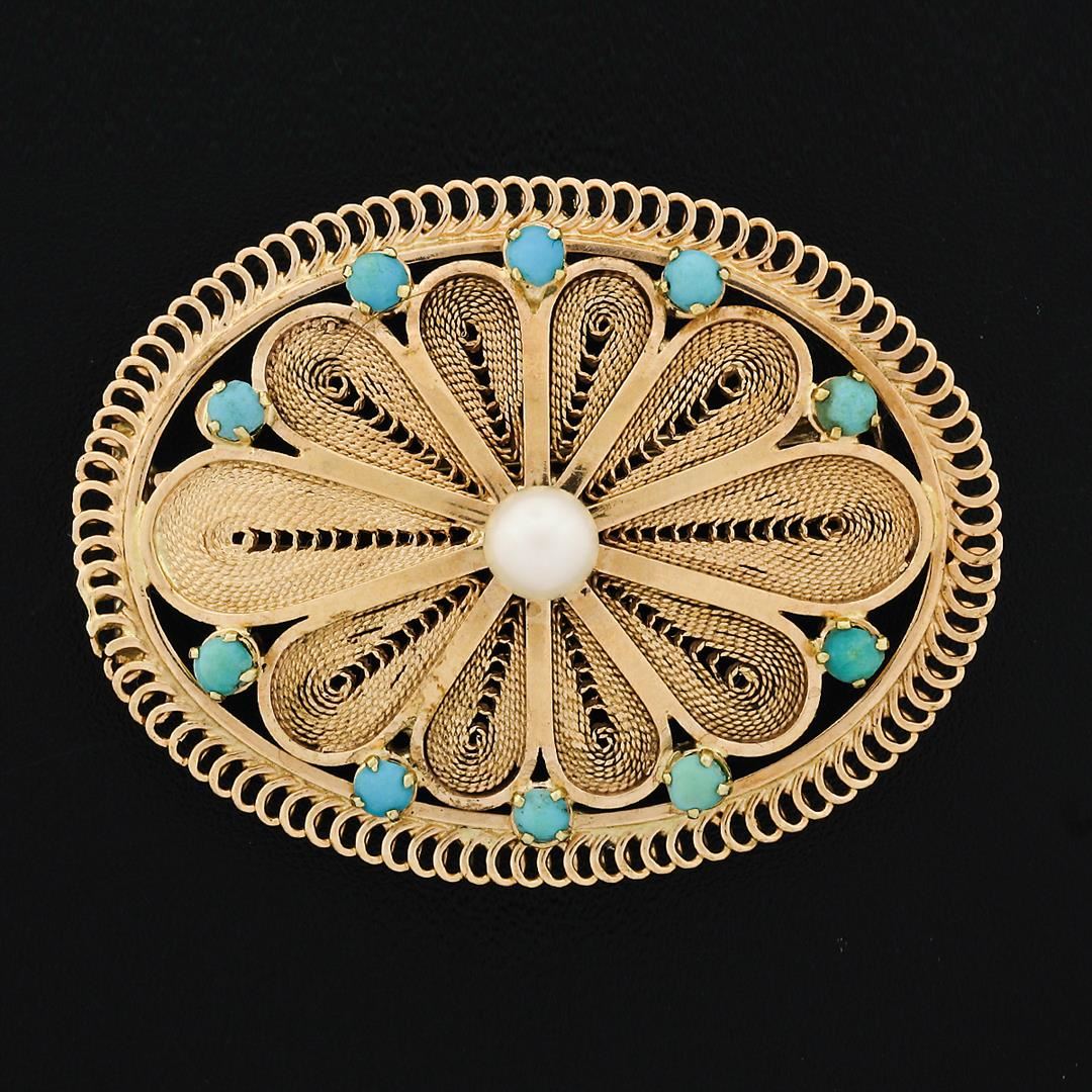 A vintage 14k yellow gold filigree work brooch or pendant with 1 round shaped cultured pearl (5.55mm) surrounded with 10 round cabochon cut natural turquoise (2.85mm). Measures 45.72x35.04mm and weighs a total of 15.00 grams.