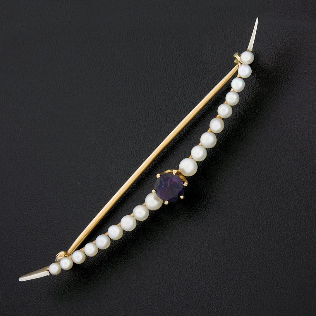 A vintage solid 14k yellow gold & platinum crescent brooch, with 18 round shape cultured seed pearls (2.2mm to 3.2mm ), and 1 round brilliant cut natural amethyst (5.1mm / 0.50ct). Measures 6.35x63.30mm and weighs a total of 3.87 grams.