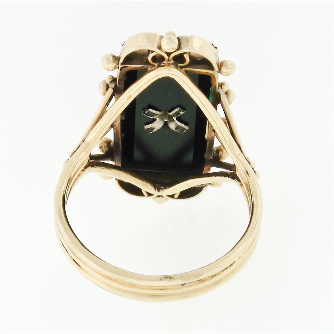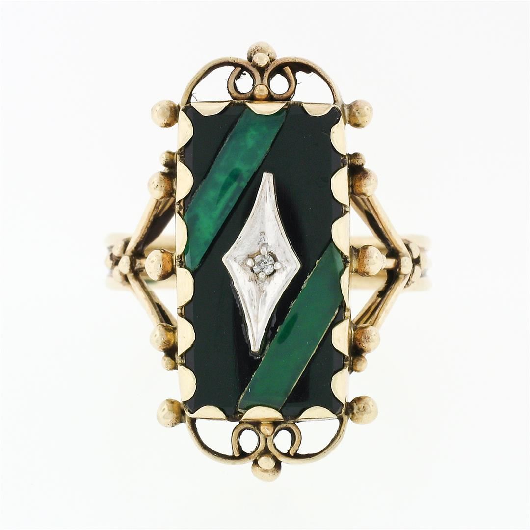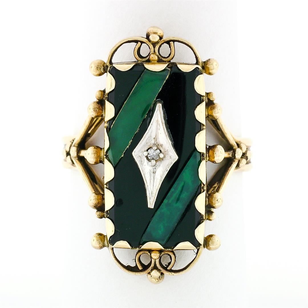 Vintage 14k Gold Rectangular Black Onyx w/ Green Agate Stripes Long Dinner Ring
