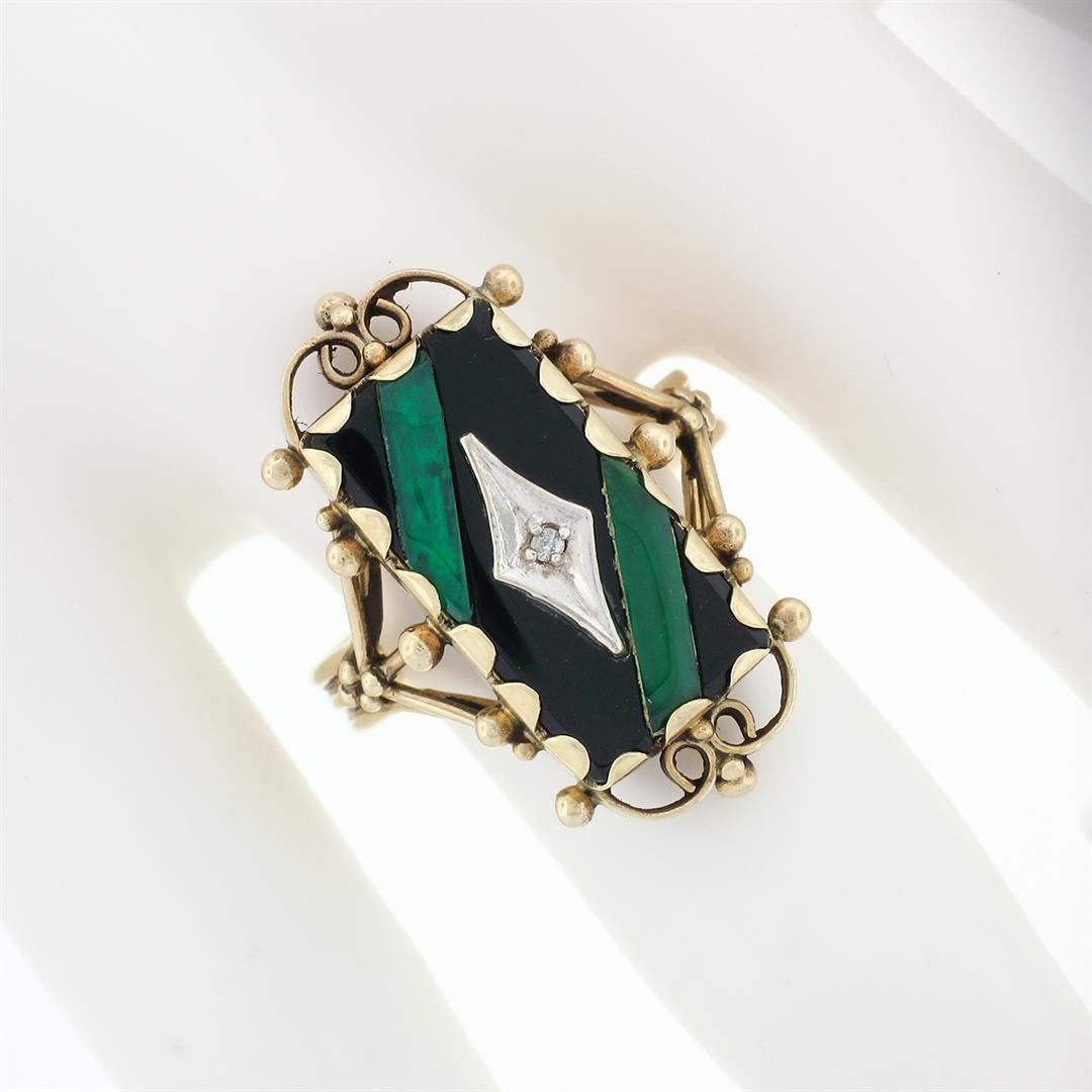 A vintage tow tone solid 14k gold dinner ring with 2 custom cut natural green agate stones set into a natural rectangular black onyx (18.0x10.0mm)and accented with a natural round single cut diamond (G - SI1; 0.01ct). The ring is size 7.5, weighs a total of 5.58 grams, and measures 25.59mm wide.
