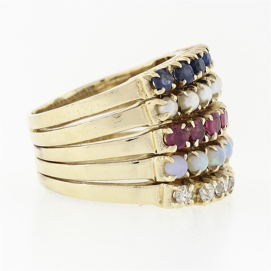 A vintage solid 14k yellow gold 5 band harem stack ring, featuring round shape 7 sapphires (0.60ctw ), 7 rubies (0.70ctw), 7 cultures pearls (2.30mm), 7 natural diamonds (F - VS1/VS2 ; 0.35ctw), 7 natural opals (2.51mm). The ring is size 7, weighs a total of 13.23 grams, and measures 16.96mm wide.