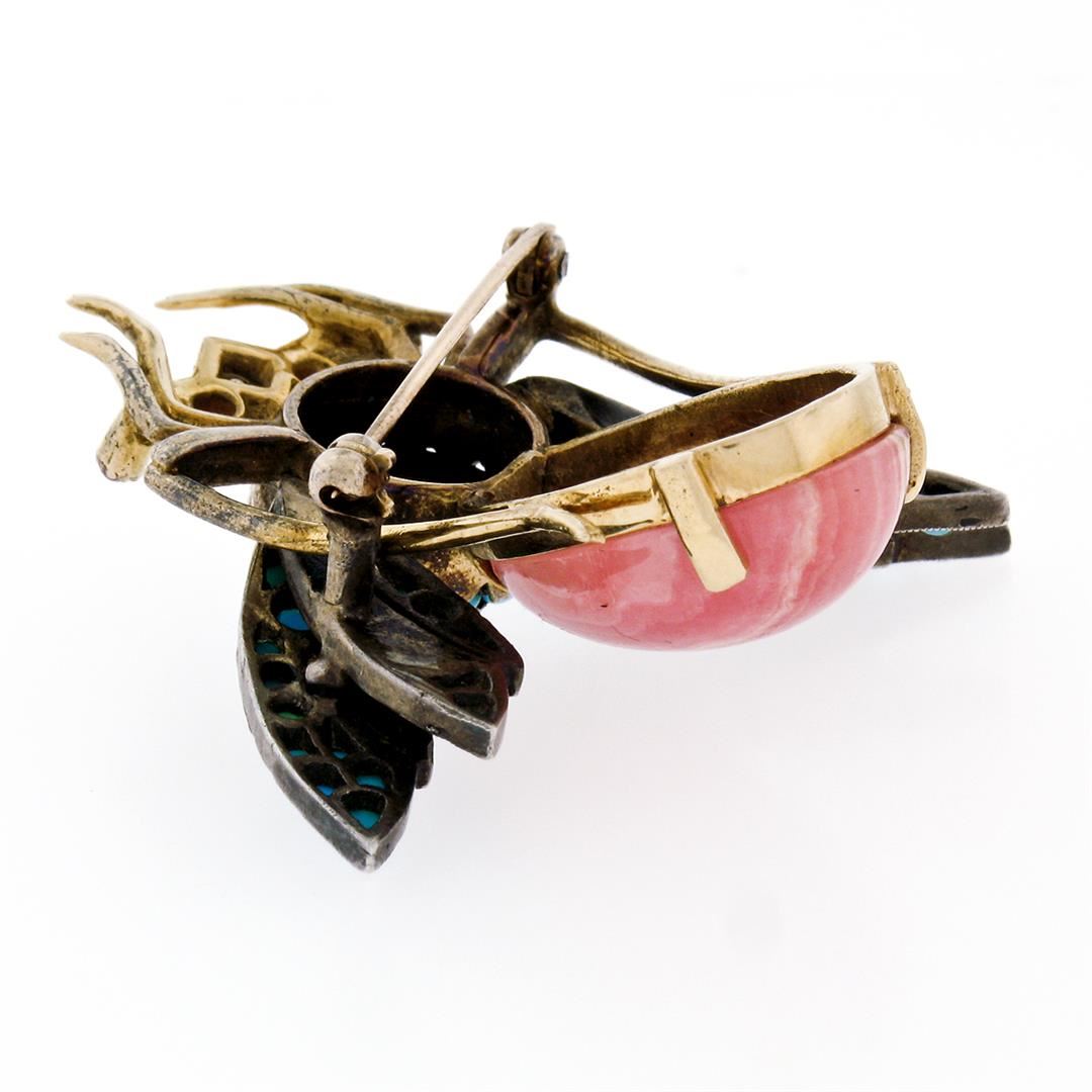 A vintage 14k yellow gold and sterling silver bee fly pin brooch, featuring 55 cabochon cut natural turquoises (1.5mm-3.3mm), and 4 cabochon cut natural rubies (0.20ctw ), with 1 transitional cut natural diamond ( G- VS2; 0.09ctw), and 1 oval cabochon cut natural rhodochrosite (20.25x15.0mm). Measures 41.75x42.30mm and weighs a total of 18.79 grams.