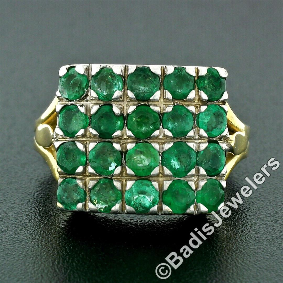 A vintage solid 14k yellow gold and silver top platter ring, with 20 round brilliant cut natural emerlads (2.40ctw). The ring is size 8.5, weighs a total of 8.83 grams, and measures 14.70mm wide.