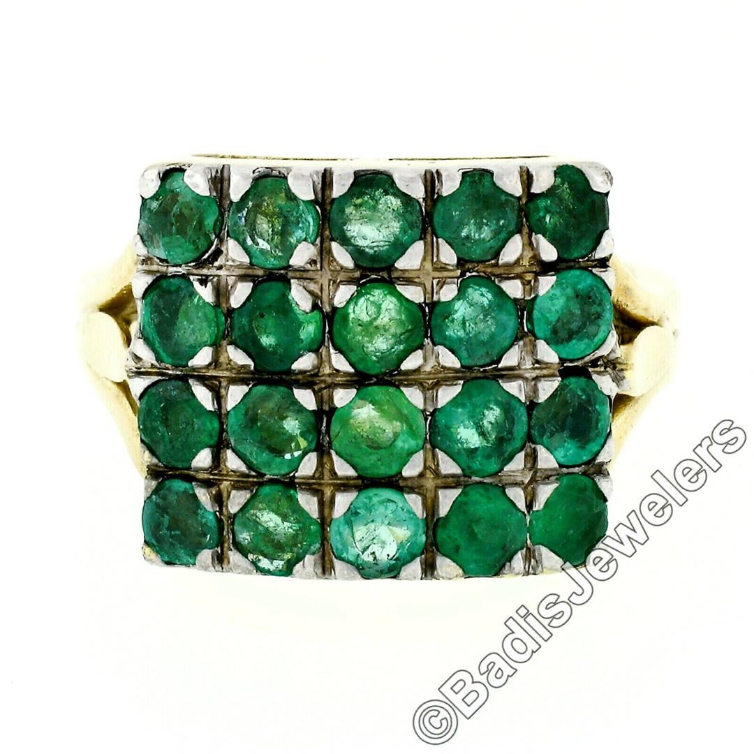 A vintage solid 14k yellow gold and silver top platter ring, with 20 round brilliant cut natural emerlads (2.40ctw). The ring is size 8.5, weighs a total of 8.83 grams, and measures 14.70mm wide.