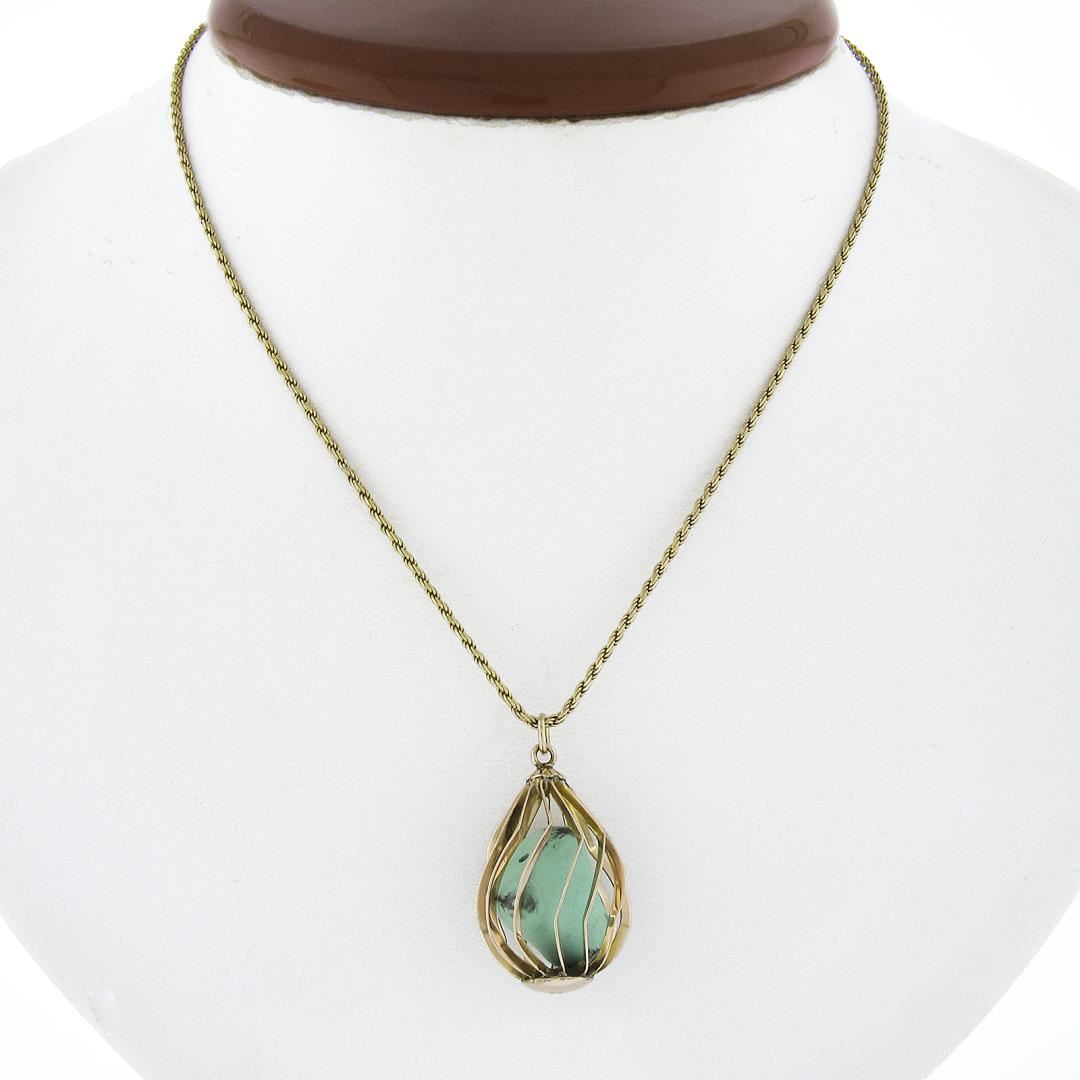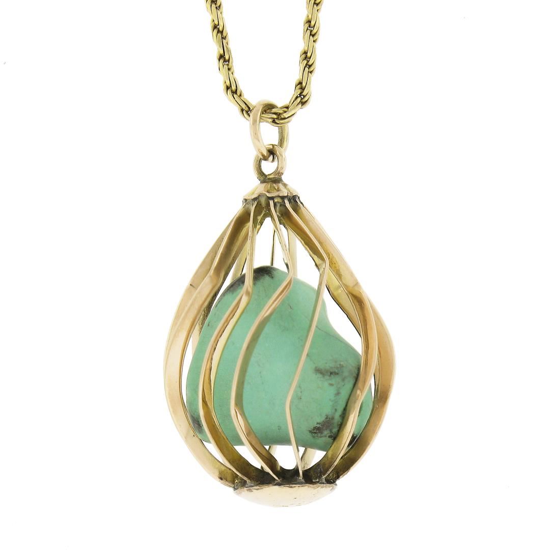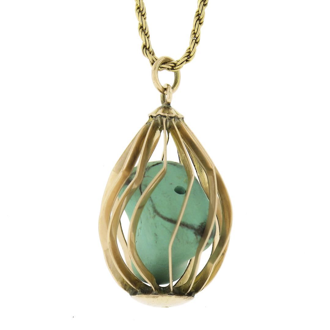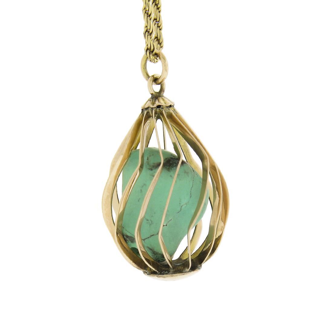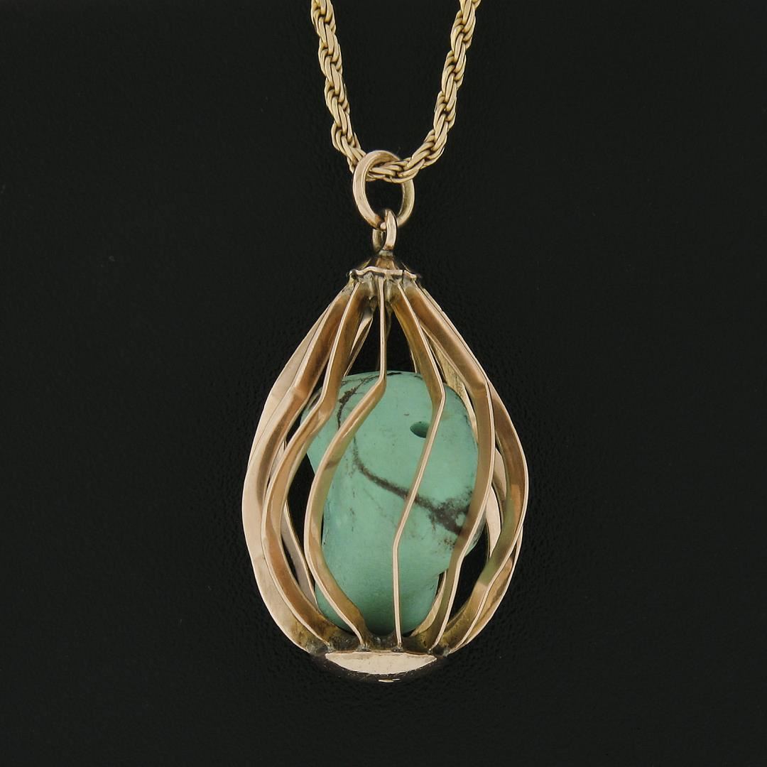 A vintage solid 14k yellow gold basket pendant necklace, with 1 tunmbled shape natural turquoise. 16 inch rope link chain, 8.32 grams total weight, pendant measures 28.6x16.8mm.