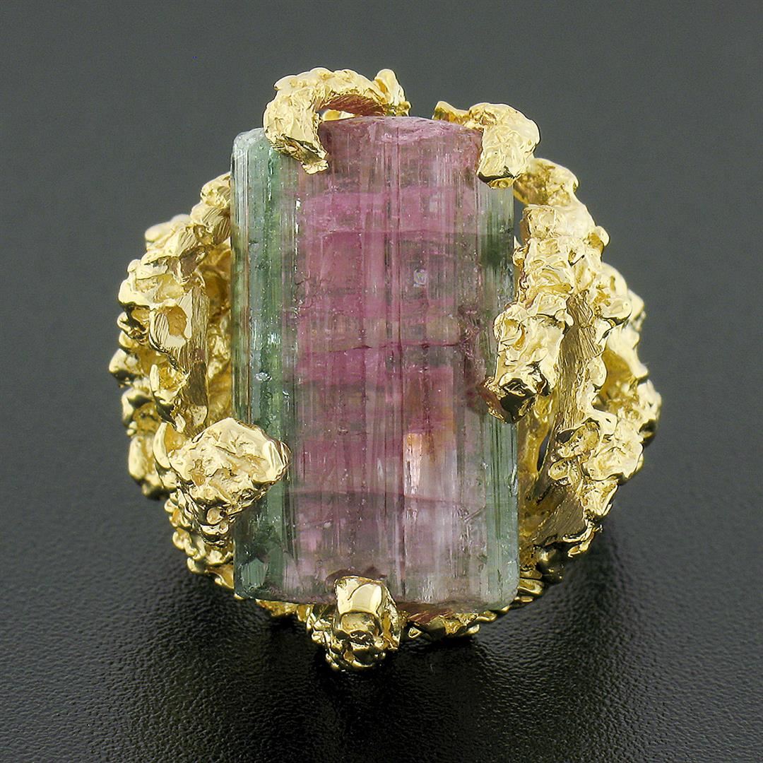 A solid 14k yellow gold freefrom ring, with 1 uncut natural tourmaline (21x13mm - 25ct). The ring is size 6.5, weighs a total of 19.41 grams, and measures 26.30mm wide.