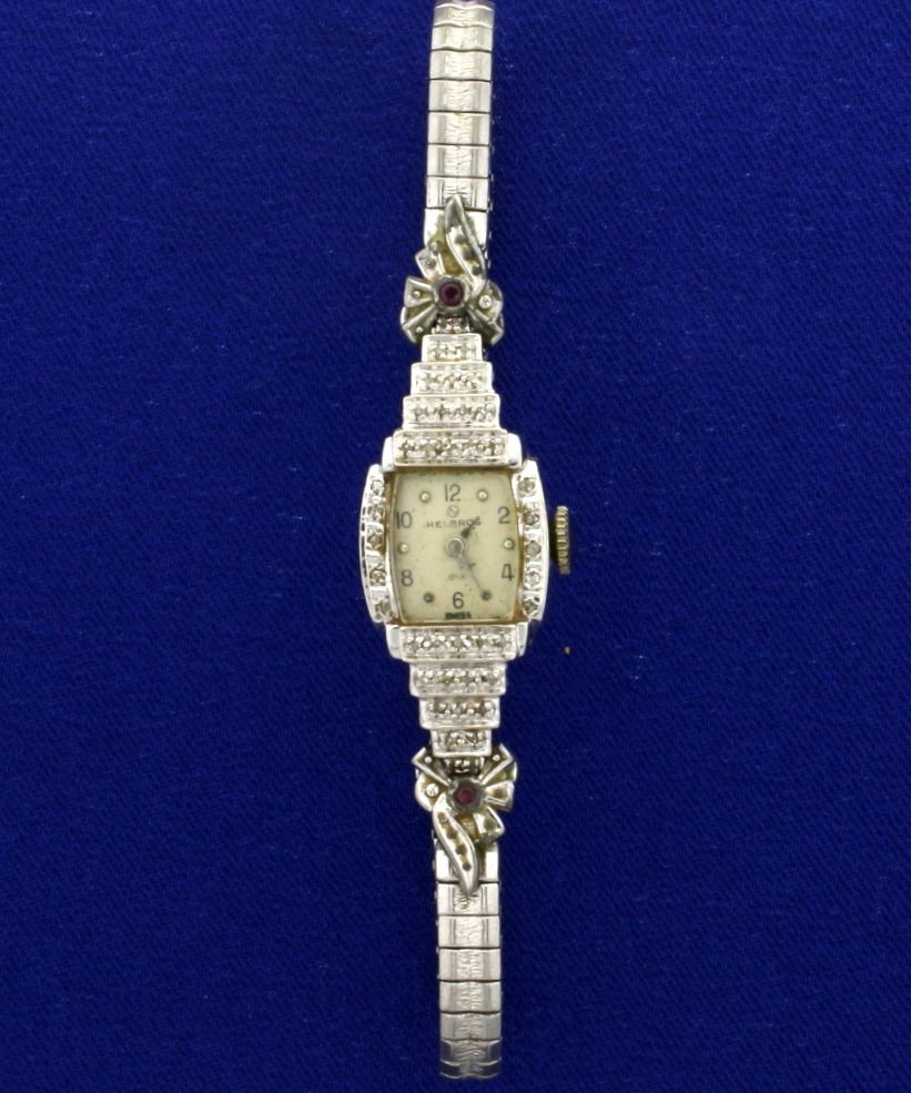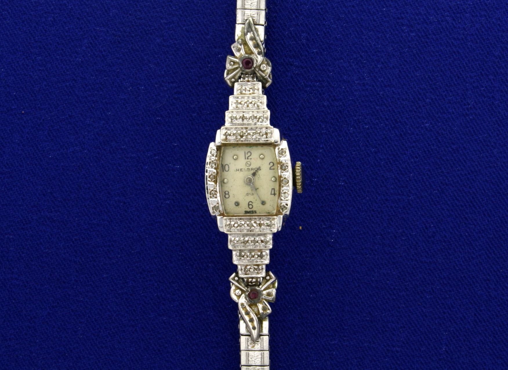 In 14k white gold, containing 40 rose cut diamonds in bezel. Wind Swiss movement runs great. Original Band has ruby on each side.