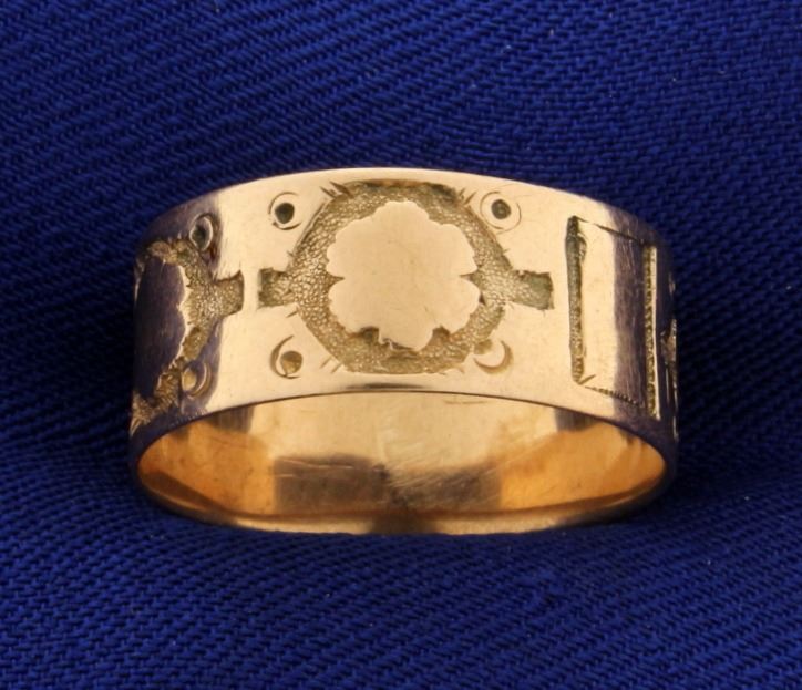 In 14k rose gold. 8.3mm wide, size 8 1/4. Hand etched shapes. 3.1g.