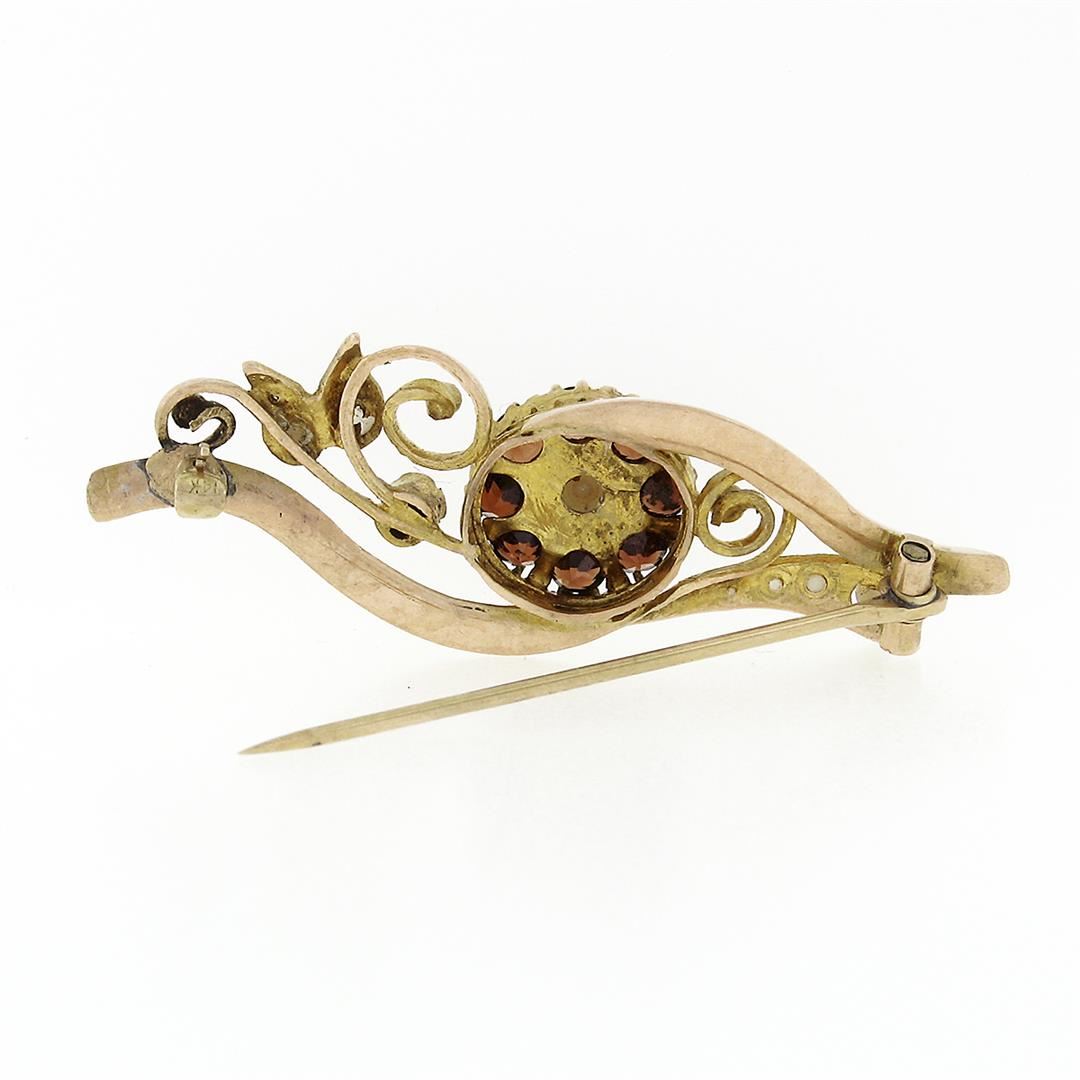 A vintage solid 14k rosy yellow gold pin brooch, with 8 round cut natural garnets (1.04ct ), with 1 round cut natural ruby (0.12ct), 1 round shape cultured mabe pearl (4.75mm), & 8 round shape cultured seed pearls (2.3 to 1.5mm). Measures 14.75x46.1mm and weighs a total of 4.17 grams.