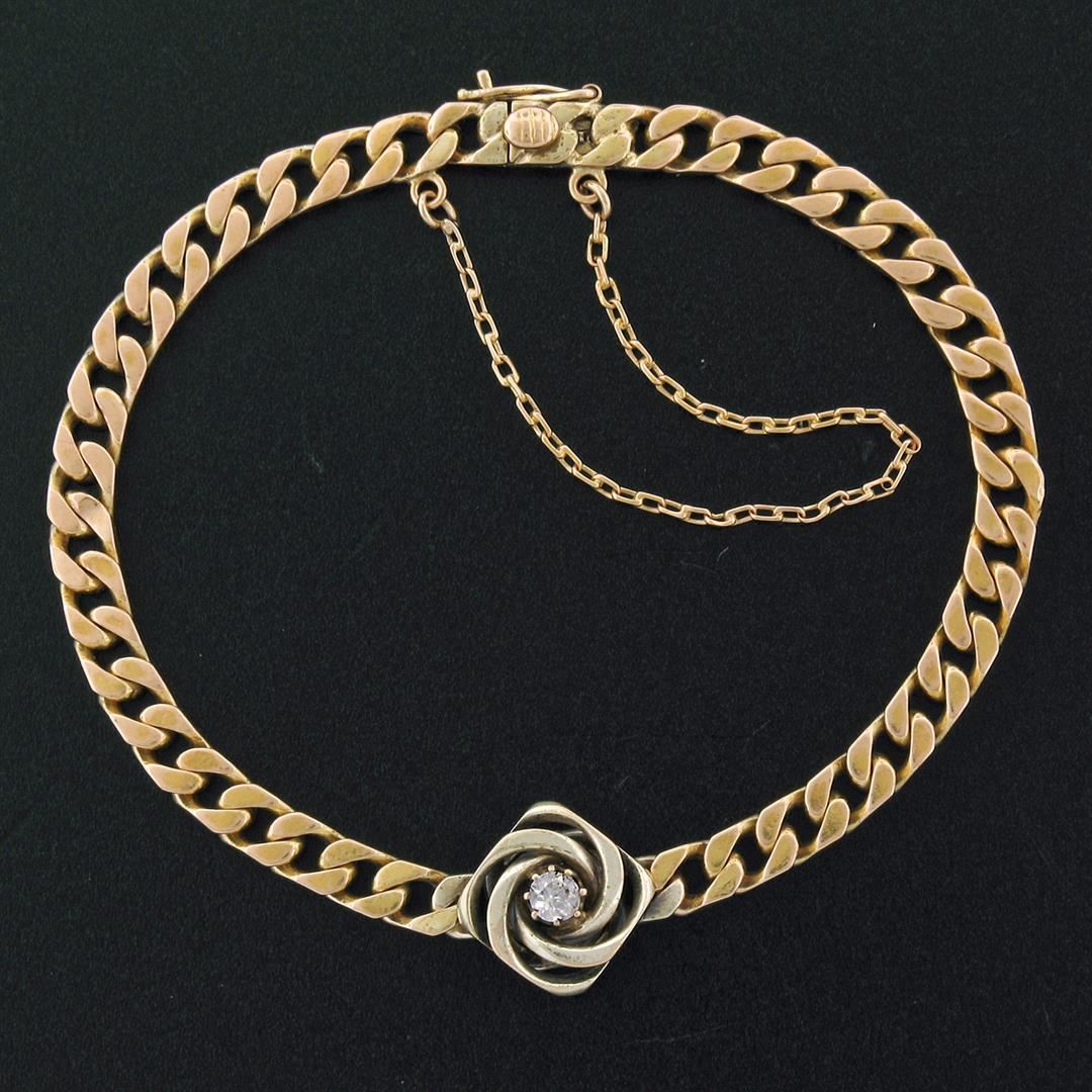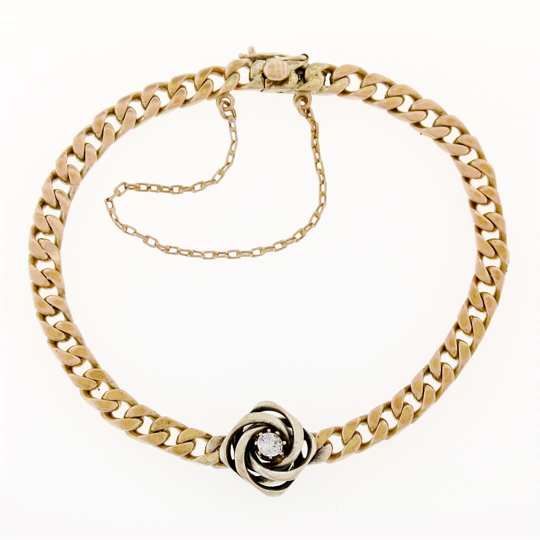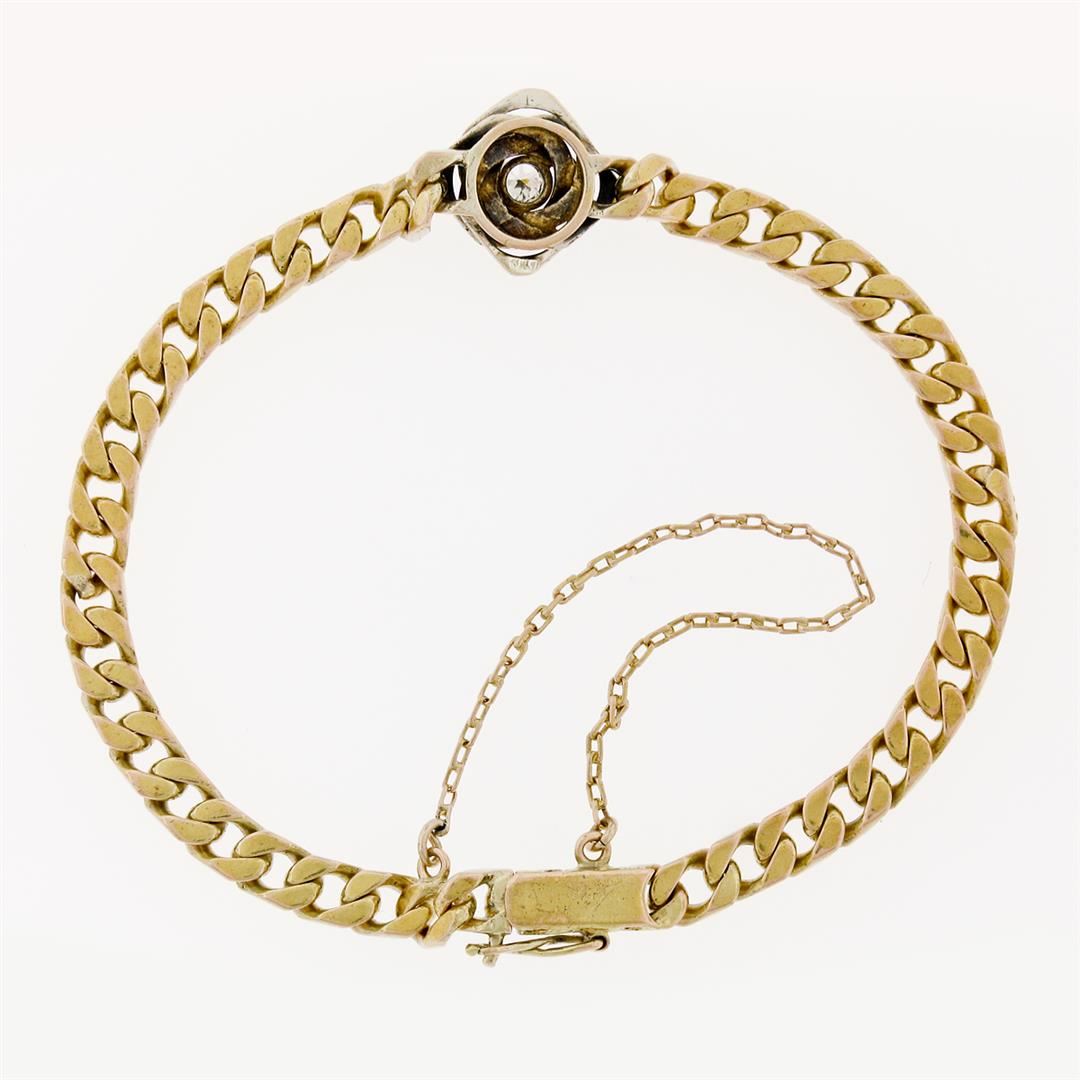 A vintage solid 14k yellow and white gold bracelet, with 1 transitional cut natural diamond (F - VS1 ; 0.17ct). It weighs a total of 14.37 grams, measures 6.40mm wide, and measures 7 inches in length.