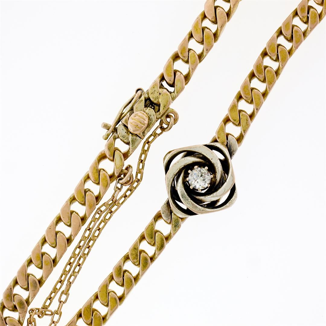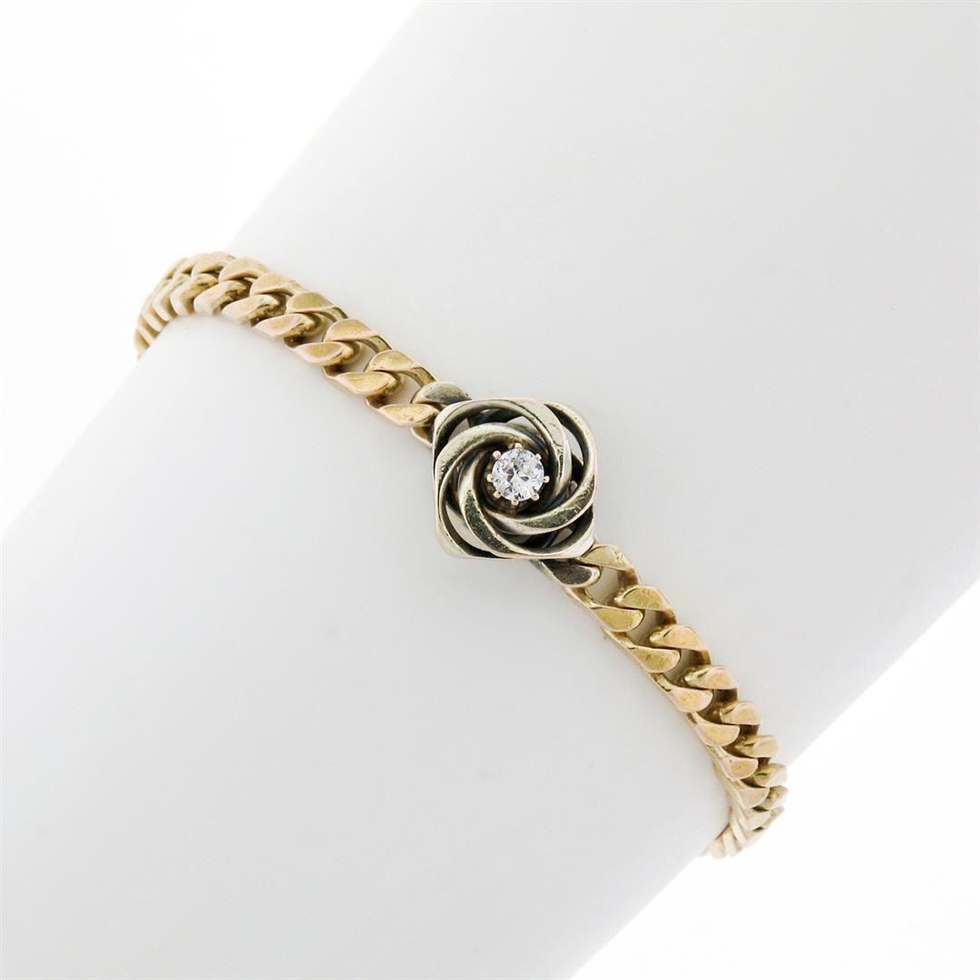 A vintage solid 14k yellow and white gold bracelet, with 1 transitional cut natural diamond (F - VS1 ; 0.17ct). It weighs a total of 14.37 grams, measures 6.40mm wide, and measures 7 inches in length.