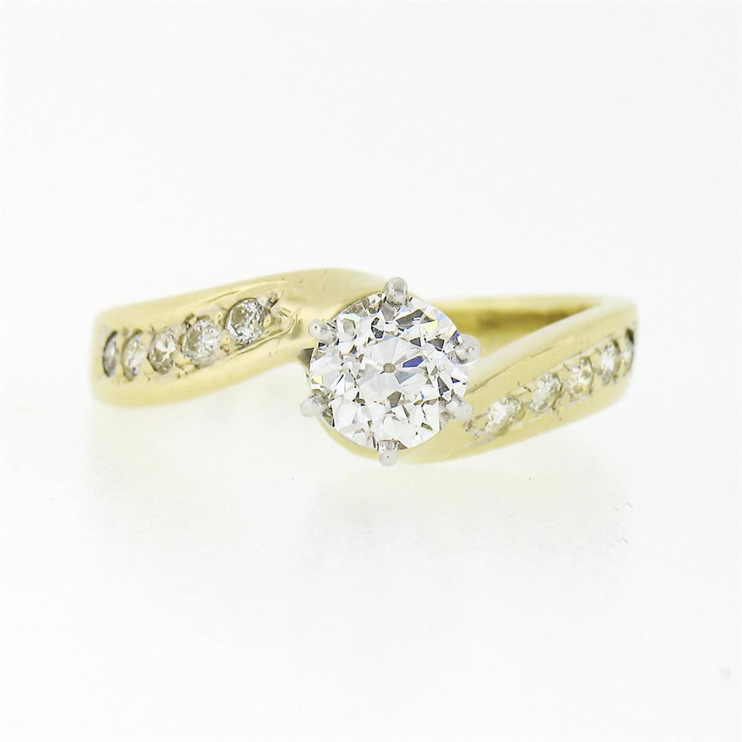 A vintage solid 14k yellow & white gold engagement ring, featuring 1 old european cut natural diamond (G - VS2 ; 0.54ct ), & 10 round briliiant cut natural diamonds (G/H - SI1/SI2 ; 0.20ctw). The ring is size 5.5, weighs a total of 2.59 grams, and measures 6.1mm wide.