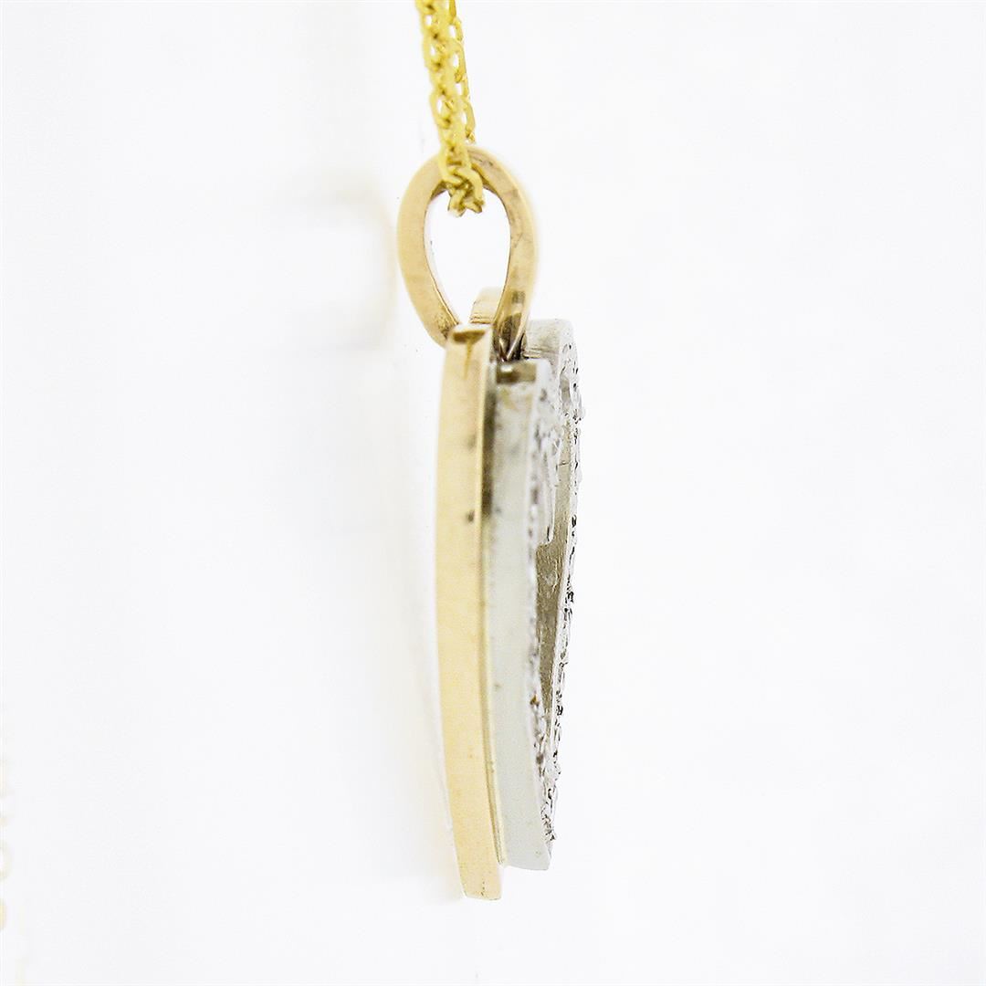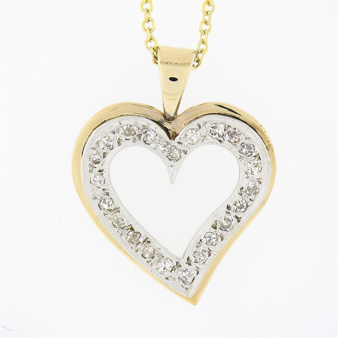 A vintage solid 14k yellow and white gold heart pendant necklace, featuring 22 single cut natural diamonds (G/H- SI1/I1; 0.22ctw). The pendant weighs a total of 4.23 grams, measures 22.30x17.40mm including the bail, and 16 inch cable link chain.