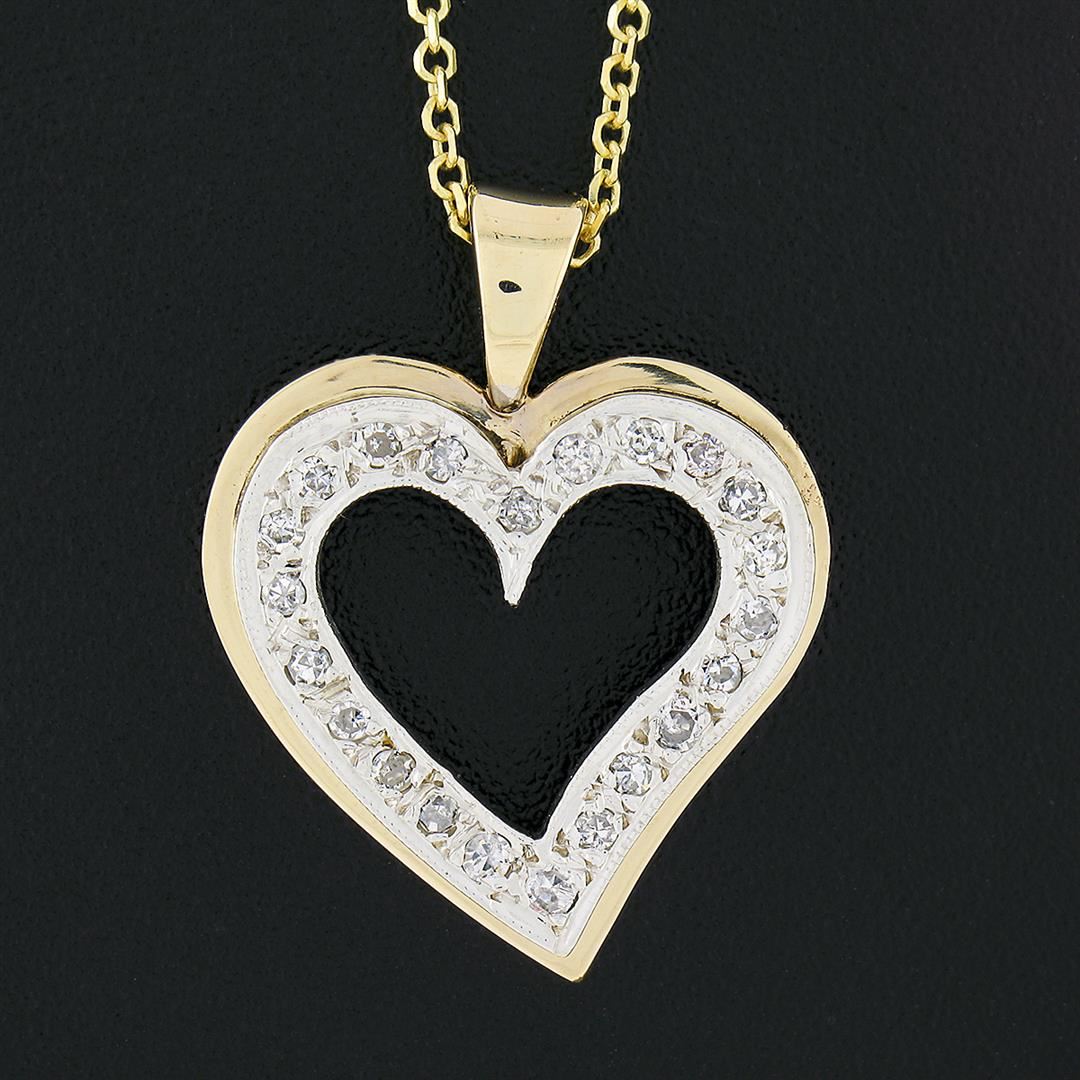 Vintage 14k TT Gold .22 ctw Pave Diamond Dual Layer Open Heart Pendant & 16" Cha