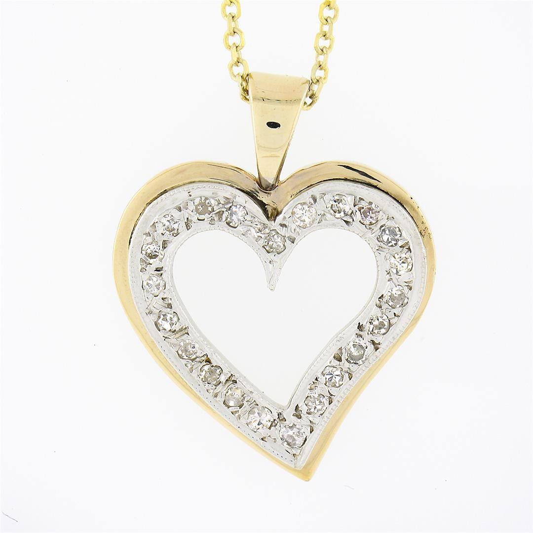 Vintage 14k TT Gold .22 ctw Pave Diamond Dual Layer Open Heart Pendant & 16" Cha